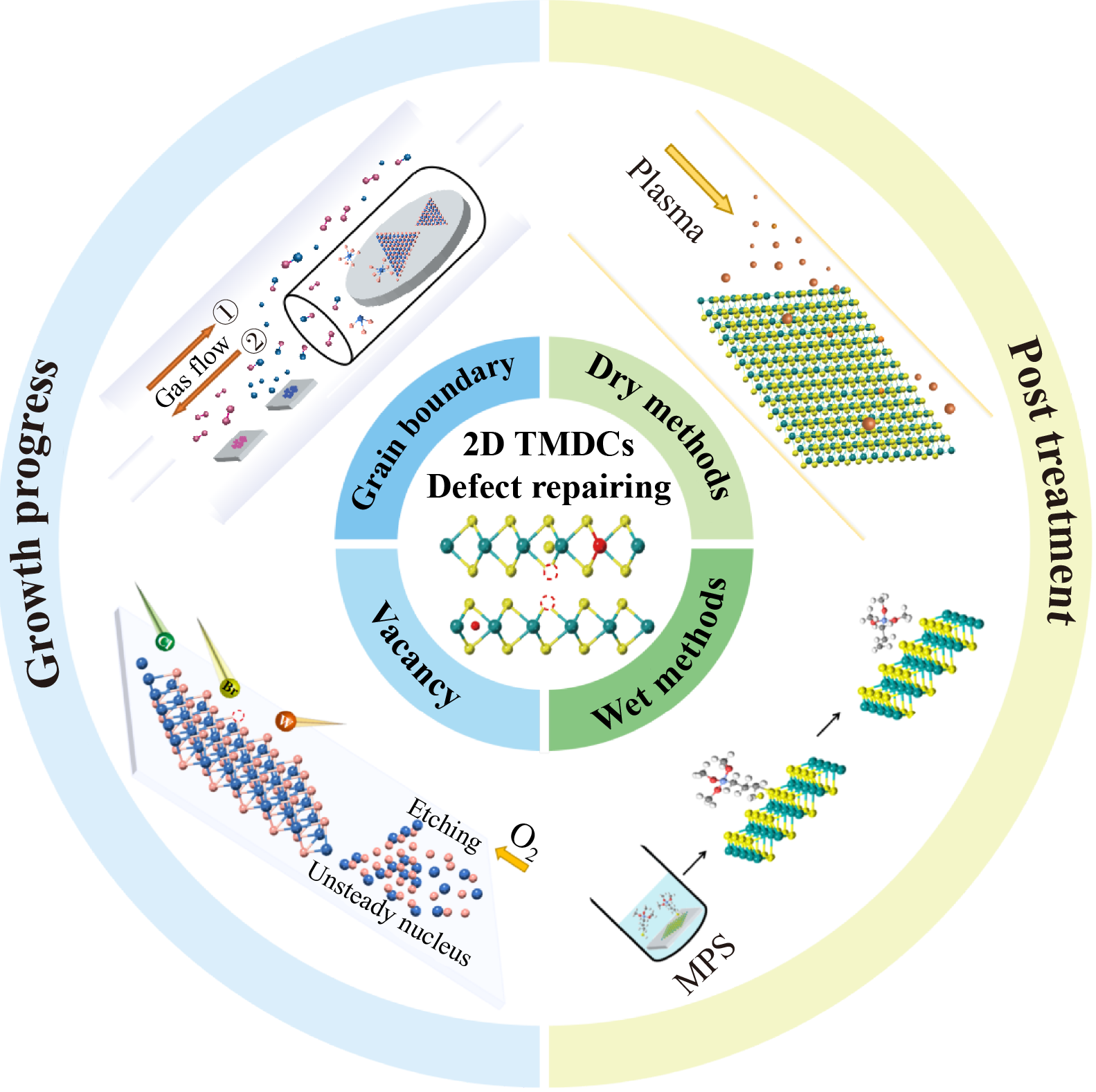 Atomically thin two-dimensional (2D) transition metal dichalcogenides (TMDCs) have stimulated enormous research interest due to rich phase structure, high theoretical carrier mobility and layer-dependent bandgap. In view of the close correlation between defects and properties in 2D TMDCs, more attentions have been paid on the defect engineering in recent years, however the mechanism is still unclear. Herein, we review the critical progress of defect engineering and provide an extensive way to modulate the properties depressed by defects. To insight into the defect engineering, we firstly introduce two common kinds of defects during the growth progress of TMDCs and the possible distribution of energy levels those defects could induce. Then, various methods to improve point defects and grain boundaries during the period of growth are discussed intensively, with the assistance of which more large-area TMDCs films can be obtained. Considering the defects in TMDCs are inevitable regardless of concentration, we also highlight strategies to heal the defects after growth. Through dry methods or wet methods, the chalcogen vacancies can be repaired and thus, the performance of electronic device would be significantly enhanced. Finally, we propose the challenges and prospective for defect engineering in 2D TMDCs materials to support the optimization of device and lead them to wide applied fields.