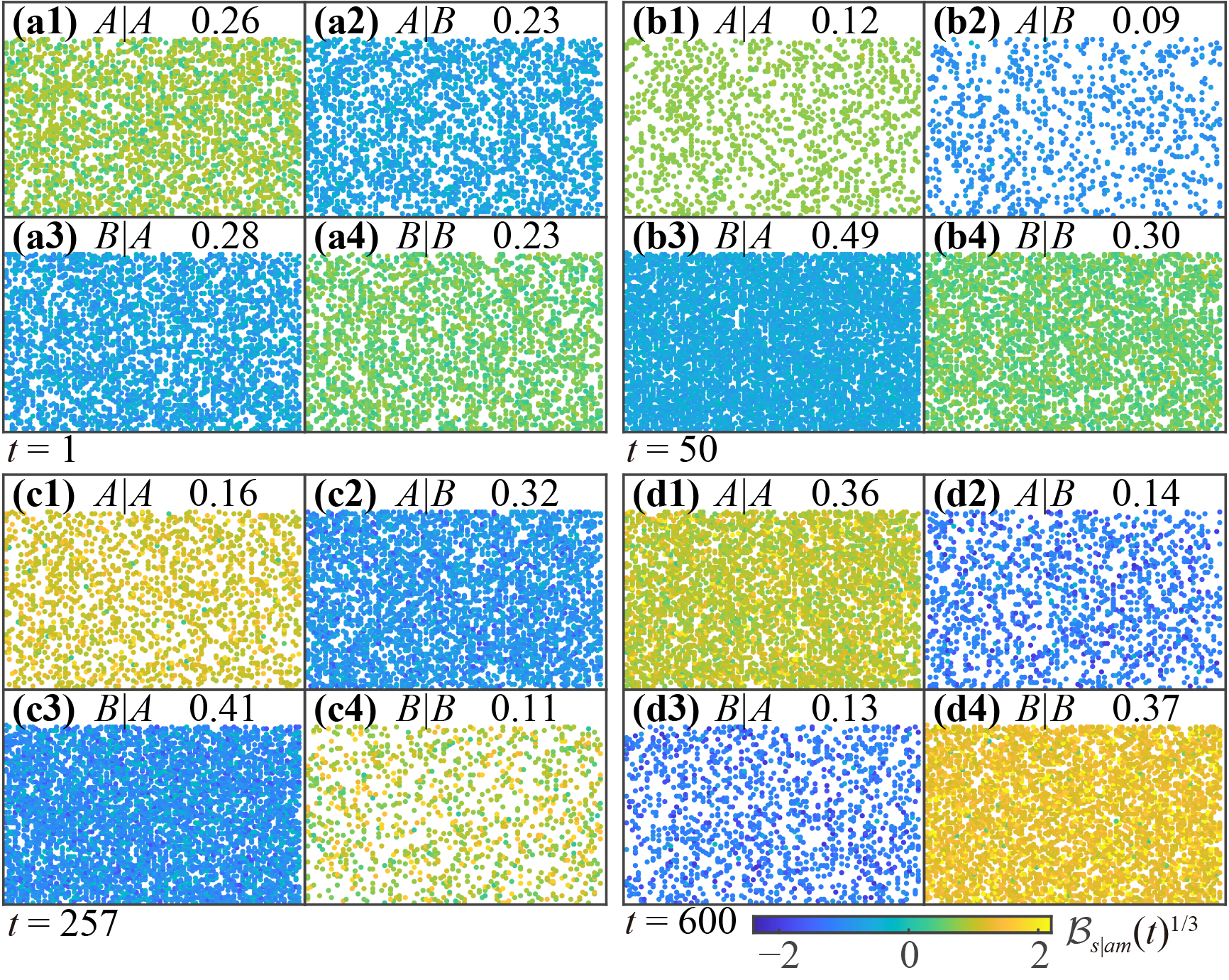 Download coverWhether the complex game system composed of a large number of artificial intelligence (AI) agents empowered with reinforcement learning can produce extremely favorable collective behaviors just through the way of agent self-exploration is a matter of practical importance. In this paper, we address this question by combining the typical theoretical model of resource allocation system, the minority game model, with reinforcement learning. Each individual participating in the game is set to have a certain degree of intelligence based on reinforcement learning algorithm. In particular, we demonstrate that as AI agents gradually becomes familiar with the unknown environment and tries to provide optimal actions to maximize payoff, the whole system continues to approach the optimal state under certain parameter combinations, herding is effectively suppressed by an oscillating collective behavior which is a self-organizing pattern without any external interference. An interesting phenomenon is that a first-order phase transition is revealed based on some numerical results in our multi-agents system with reinforcement learning. In order to further understand the dynamic behavior of agent learning, we define and analyze the conversion path of belief mode, and find that the self-organizing condensation of belief modes appeared for the given trial and error rates in the AI system. Finally, we provide a detection method for period-two oscillation collective pattern emergence based on the Kullback−Leibler divergence and give the parameter position where the period-two appears.