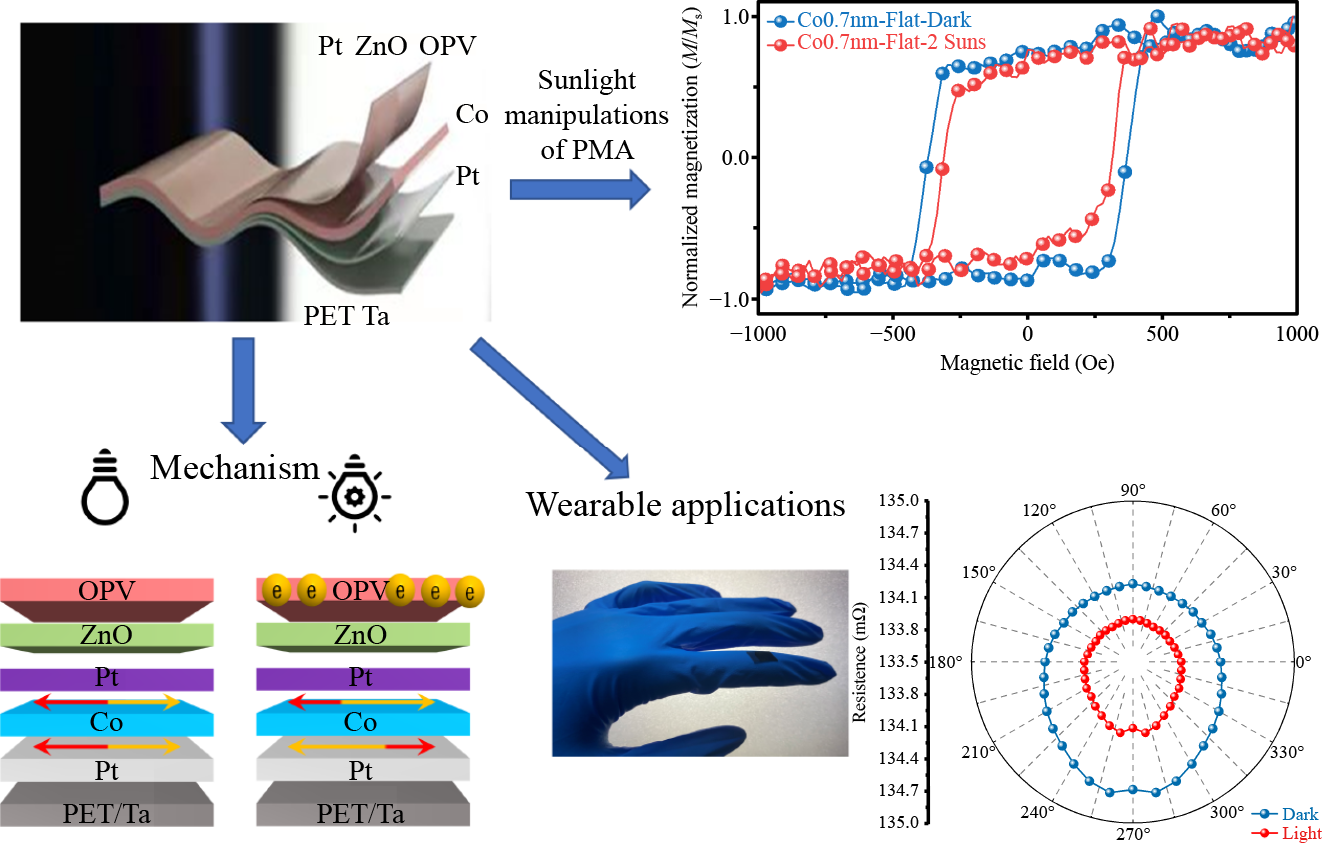 Flexible electronics/spintronics attracts researchers’ attention for their application potential abroad in wearable devices, healthcare, and other areas. Those devices’ performance (speed, energy consumption) is highly dependent on manipulating information bits (spin-orientation in flexible spintronics). In this work, we established an organic photovoltaic (OPV)/ZnO/Pt/Co/Pt heterostructure on flexible PET substrates with perpendicular magnetic anisotropy (PMA). Under sunlight illumination, the photoelectrons generated from the OPV layer transfer into the PMA heterostructure, then they reduce the PMA strength by enhancing the interfacial Rashba field accordingly. The coercive field (Hc) reduces from 800 Oe to 500 Oe at its maximum, and the magnetization can be switched up and down reversibly. The stability of sunlight control of magnetization reversal under various bending conditions is also tested for flexible spintronic applications. Lastly, the voltage output of sunlight-driven PMA is achieved in our prototype device, exhibiting an excellent angular dependence and opening a door towards solar-driven flexible spintronics with much lower energy consumption.