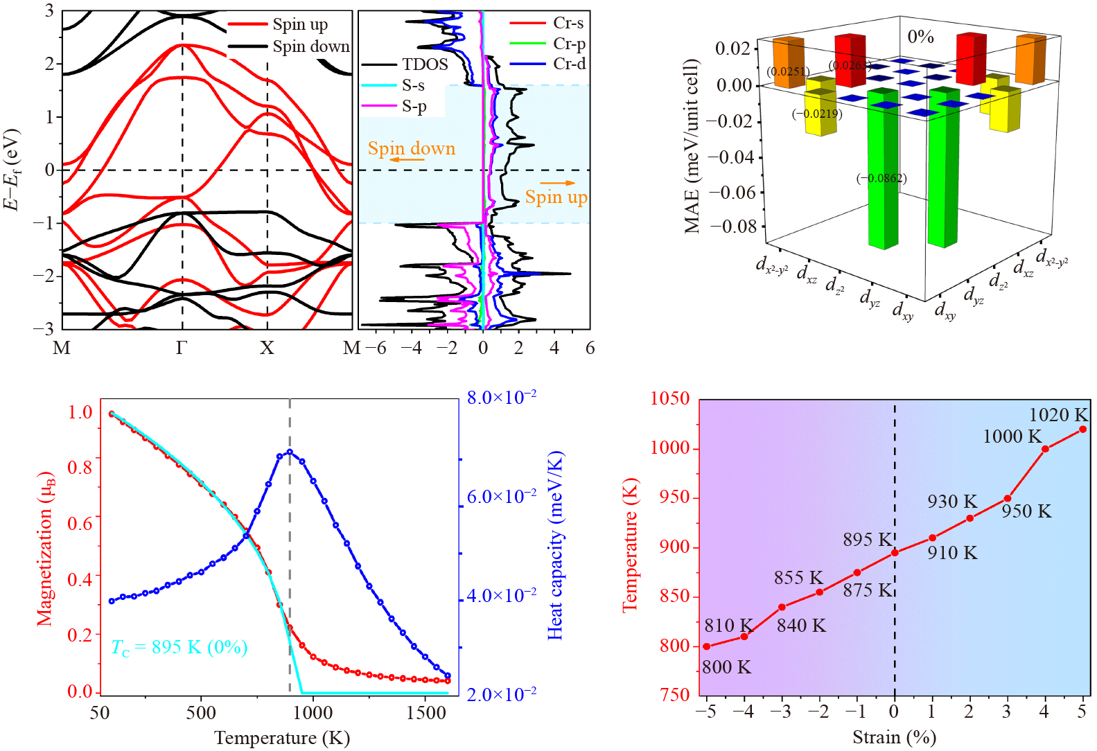 Two-dimensional materials with high-temperature ferromagnetism and half-metallicity have the latest applications in spintronic devices. Based on first-principles calculations, we have investigated a novel two-dimensional CrS2 phase with an orthorhombic lattice. Our results suggest that it is stable in dynamics, thermodynamics, and mechanics. The ground state of monolayer orthorhombic CrS2 is both ferromagnetic and half-metallic, with a high Curie temperature of 895 K and a large spin-flipping gap on values of 0.804 eV. This room-temperature ferromagnetism and half-metallicity can maintain stability against a strong biaxial strain ranging from −5% to 5%. Meanwhile, increasing strain can significantly maintain the out-of-plane magnetic anisotropy. A density of states analysis, together with the orbital-resolved magnetic anisotropy energy, has revealed that the strain-enhanced MAE is highly related to the 3d-orbital splitting of Cr atoms. Our results suggest the monolayer orthorhombic CrS2 is an ideal candidate for future spintronics.