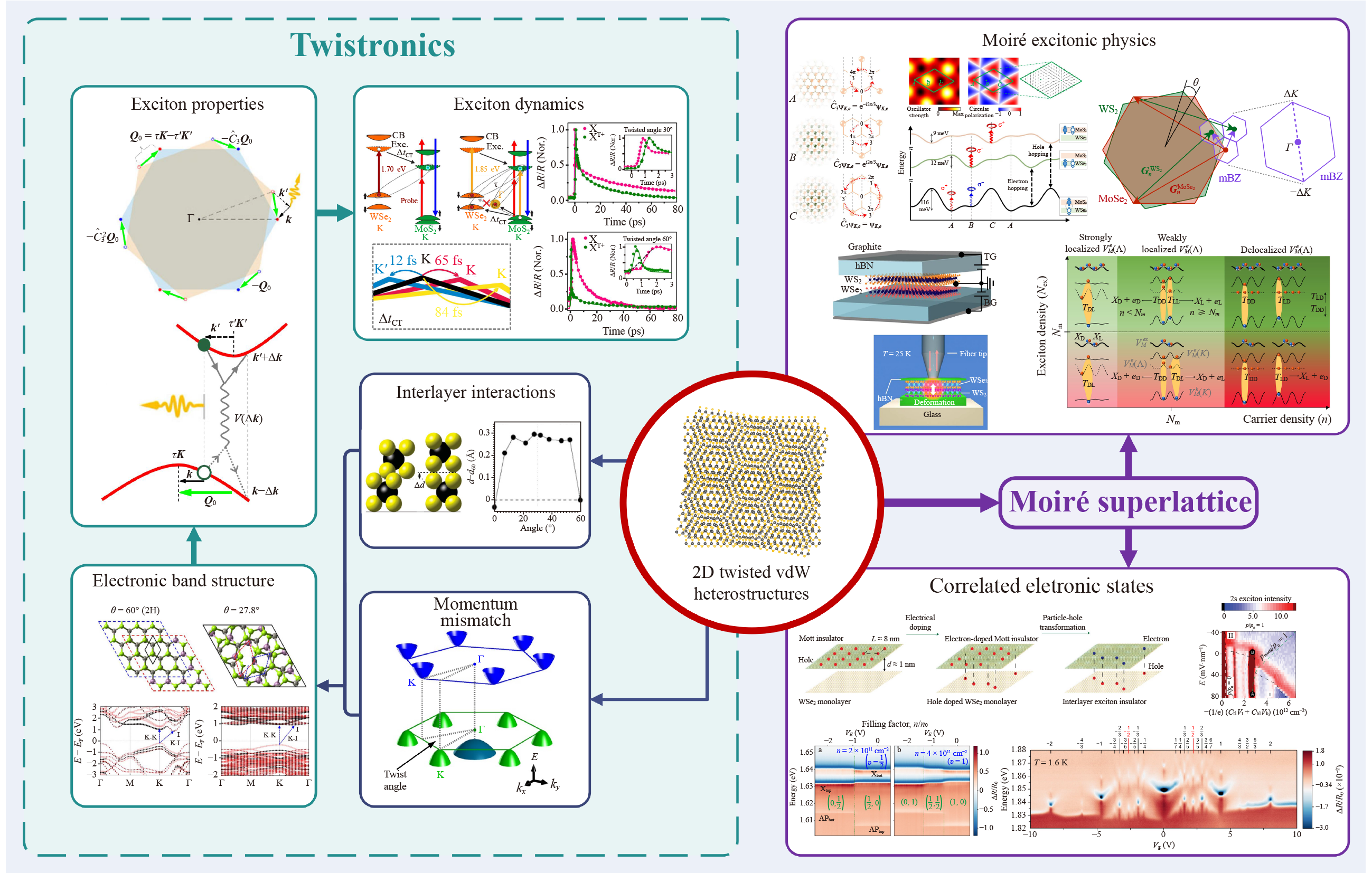 Heterostructures composed of two-dimensional van der Waals (vdW) materials allow highly controllable stacking, where interlayer twist angles introduce a continuous degree of freedom to alter the electronic band structures and excitonic physics. Motivated by the discovery of Mott insulating states and superconductivity in magic-angle bilayer graphene, the emerging research fields of “twistronics” and moiré physics have aroused great academic interests in the engineering of optoelectronic properties and the exploration of new quantum phenomena, in which moiré superlattice provides a pathway for the realization of artificial excitonic crystals. Here we systematically summarize the current achievements in twistronics and moiré excitonic physics, with emphasis on the roles of lattice rotational mismatches and atomic registries. Firstly, we review the effects of the interlayer twist on electronic and photonic physics, particularly on exciton properties such as dipole moment and spin-valley polarization, through interlayer interactions and electronic band structures. We also discuss the exciton dynamics in vdW heterostructures with different twist angles, like formation, transport and relaxation processes, whose mechanisms are complicated and still need further investigations. Subsequently, we review the theoretical analysis and experimental observations of moiré superlattice and moiré modulated excitons. Various exotic moiré effects are also shown, including periodic potential, moiré miniband, and varying wave function symmetry, which result in exciton localization, emergent exciton peaks and spatially alternating optical selection rule. We further introduce the expanded properties of moiré systems with external modulation factors such as electric field, doping and strain, showing that moiré lattice is a promising platform with high tunability for optoelectronic applications and in-depth study on frontier physics. Lastly, we focus on the rapidly developing field of correlated electron physics based on the moiré system, which is potentially related to the emerging quantum phenomena.