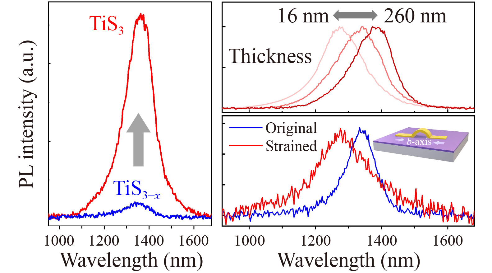 The low-dimensional light source shows promise in photonic integrated circuits. Stable layered van der Waals material that exhibits luminescence in the near-infrared optical communication waveband is an essential component in on-chip light sources. Herein, the tunable near-infrared photoluminescence (PL) of the air-stable layered titanium trisulfide (TiS3) is reported. Compared with iodine particles as a transport agent, TiS3 grown by chemical vapor transport using sulfur powder as a transport agent has fewer sulfur vacancies, which increases the luminescence intensity by an order of magnitude. The PL emission wavelength can be regulated in the near-infrared regime by thickness control. In addition, we observed an interesting anisotropic strain response of PL in layered TiS3 nanoribbon: a blue shift of PL was achieved when the uniaxial tensile strain was applied along the b-axis, while a negligible shift was observed when the strain was applied along the a-axis. Our work reveals the tunable near-infrared luminescent properties of TiS3 nanoribbons, suggesting their potential applications as near-infrared light sources in photonic integrated circuits.