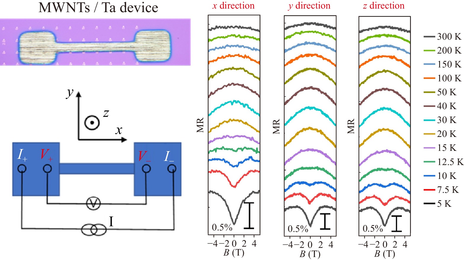 Carbon nanotubes (CNTs) have garnered significant attention due to their remarkable electronic and magnetic properties. In this research, we introduced multiwalled carbon nanotubes covered with tantalum (MWNTs/Ta) to systematically modulate the magnetoresistive properties of the MWNTs/Ta hybrid nanostructures. We observed distinct changes in both positive and negative magnetoresistances of MWNTs/Ta across a broad temperature range using a physical property measurement system and a four-terminal method. This study on temperature-dependent magnetoresistive behavior of the MWNTs/Ta sheds light on the fundamental properties of carbon-based materials and holds promise for practical applications in the field of spintronic devices.