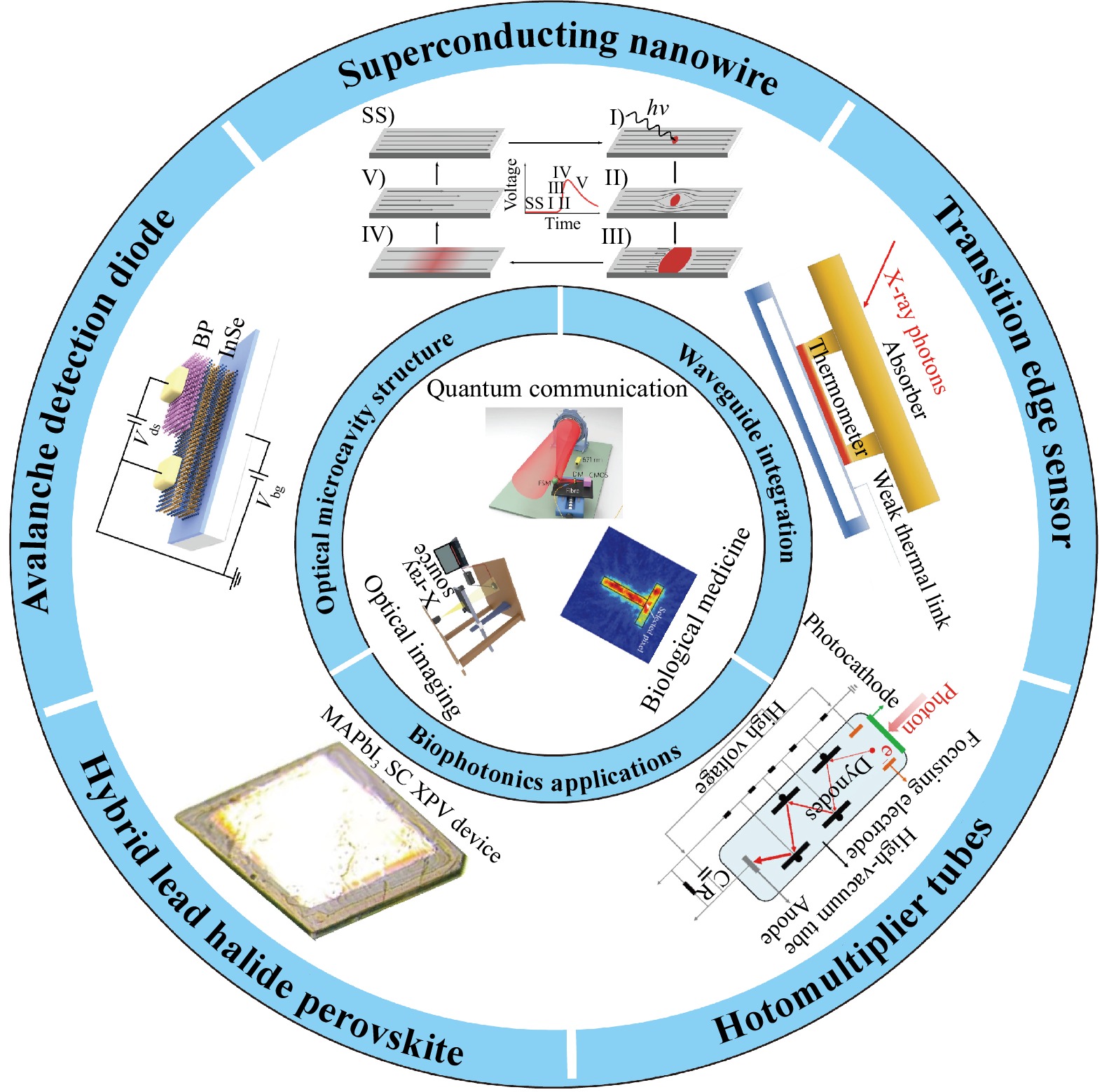 Single-photon detections (SPDs) represent a highly sensitive light detection technique capable of detecting individual photons at extremely low light intensity levels. This technology mainly relies on the mainstream SPDs, such as photomultiplier tubes (PMTs), avalanche photodiodes (SAPD), superconducting nanowire single-photon detectors (SNSPDs), superconducting transition-edge sensor (TES), and hybrid lead halide perovskite. However, the complexity and high manufacturing cost, coupled with the requirement of special conditions like a low-temperature environment, pose significant challenges to the wide adoption of SPDs. To address the challenges faced by SPDs, significant efforts have been devoted to enhancing their performance. In this review, we first summarize the principles and technical challenges of several SPDs. Conductors, superconductors, semiconductors, 3D bulk materials, 2D film materials, 1D nanowires, and 0D quantum dots have all been discussed for single-photon detectors. Methods such as special optical structure, waveguide integration, and strain engineering have been employed to elevate the performance of single-photon detectors. These techniques enhance light absorption and modulate the band structure of the material, thereby improving the single-photon sensitivity. By providing an overview of the current situation and future challenges of SPDs, this review aims to propose potential solutions for photon detection technology.