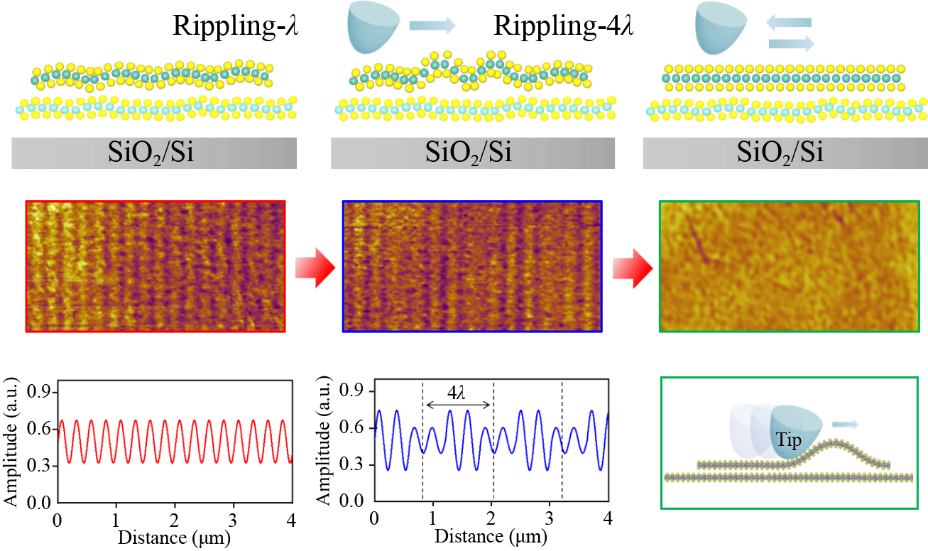 The van der Waals interface structures and behaviors are of great importance in determining the physical properties of two-dimensional atomic crystals and their heterostructures. The delicate interfacial properties are sensitively dependent on the mechanical behaviors of atomically thin films under external strain. Here, we investigated the strain-engineered rippling structures at the CVD-grown bilayer-MoS2 interface with advanced atomic force microscopy (AFM). The in-plane compressive strain is sequentially introduced into the 1L-substrate and 2L-1L interface of bilayer-MoS2 flakes via a fast-cooling process. The thermal strain-engineered rippling structures were directly visualized at the central 2H- and 3R-MoS2 bilayer regions with friction force microscopy (FFM) and bimodal AFM techniques. These rippling structures can be further artificially manipulated into the beating-like rippling features and fully erased via the contact mode AFM scanning. Our results shed lights on the strain-engineered interfacial structures of two-dimensional materials and also inspire the further investigation on the interface engineering of their electronic and optical properties.