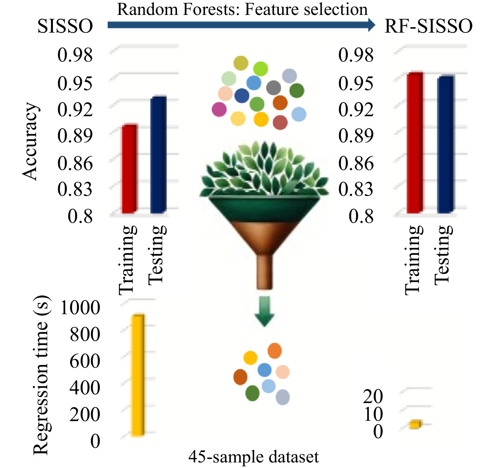 In materials science, data-driven methods accelerate material discovery and optimization while reducing costs and improving success rates. Symbolic regression is a key to extracting material descriptors from large datasets, in particular the Sure Independence Screening and Sparsifying Operator (SISSO) method. While SISSO needs to store the entire expression space to impose heavy memory demands, it limits the performance in complex problems. To address this issue, we propose a RF-SISSO algorithm by combining Random Forests (RF) with SISSO. In this algorithm, the Random Forests algorithm is used for prescreening, capturing non-linear relationships and improving feature selection, which may enhance the quality of the input data and boost the accuracy and efficiency on regression and classification tasks. For a testing on the SISSO’s verification problem for 299 materials, RF-SISSO demonstrates its robust performance and high accuracy. RF-SISSO can maintain the testing accuracy above 0.9 across all four training sample sizes and significantly enhancing regression efficiency, especially in training subsets with smaller sample sizes. For the training subset with 45 samples, the efficiency of RF-SISSO was 265 times higher than that of original SISSO. As collecting large datasets would be both costly and time-consuming in the practical experiments, it is thus believed that RF-SISSO may benefit scientific researches by offering a high predicting accuracy with limited data efficiently.