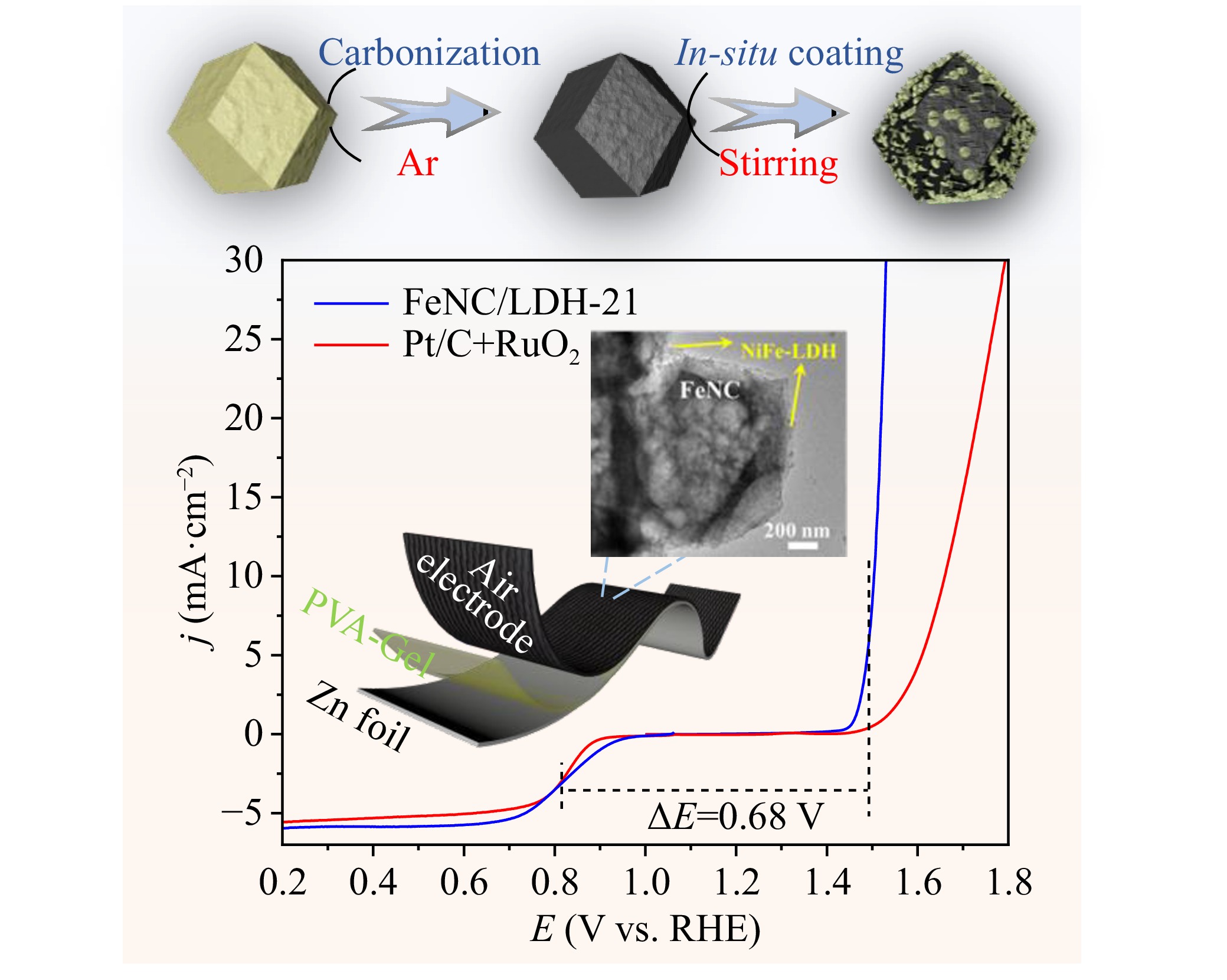 The rational design of high-performance bifunctional electrocatalysts toward both oxygen reduction reaction (ORR) and oxygen evolution reaction (OER) is critical for the development of high-efficiency zinc−air batteries (ZABs). Herein, we report a facile method to synthesize a bifunctional electrocatalyst (FeNC/LDHs), which consists of Fe-doped hollow carbon dodecahedron (FeNC) coupling with NiFe-layered double hydroxides (LDHs). The coupling integration of FeNC dodecahedra and LDH nanosheets enriches the electrochemically active surface area and modulates the electron redistribution via oxygen bridges between FeNC and LDHs, thus effectively improving electrocatalytic activity and exhibiting a small potential difference of ΔE = 0.68 V during the ORR and OER process. The optimized FeNC/LDH-21 as a cathode in zinc-air batteries demonstrates a specific capacity of 810 mAh·g−1 at 10 mA·cm−2 and a power density of 85 mW·cm−2, and stable operation over 160 h. Moreover, the as-assembled solid-state flexible ZAB reaches a power density of 32.4 mW·cm−2 and maintains a stable charge-discharge process at different bending or hammering states. This work opens an avenue for the facile and large-scale synthesis of bifunctional electrocatalysts and would propel the practical application of ZABs.
