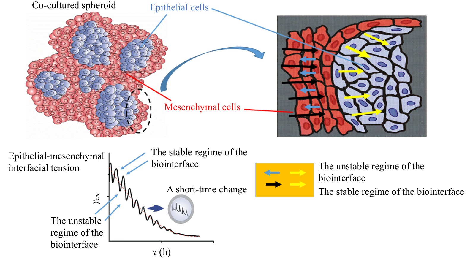 The interfacial tension between two cell subpopulations in direct contact represents a key physical parameter responsible for the self-organization of tissues during biological processes such as morphogenesis and the spreading of cancers. Higher interfacial tension (i) reduces the spreading of cancer-mesenchymal cells through the epithelial subpopulation, (ii) ensures efficient cell segregation in co-cultured systems, (iii) can induce extrusion of cancer-mesenchymal cells along the biointerface with the epithelial subpopulation, and (iv) results in the generation of higher mechanical stress along the biointerface. Inhomogeneous distribution of the interfacial tension leads to the Marangoni effect, which further facilitates the rearrangement of cells. The formation of mobile stiffness gradients, known as durotaxis, under in vivo conditions is directly related to an inhomogeneous distribution of the interfacial tension. As the product of homotypic and heterotypic cell−cell interactions, the interfacial tension depends on the distance between the subpopulations, which varies over time. This review (i) summarizes biological aspects related to the homotypic and heterotypic cell−cell interactions along the biointerface, together with the viscoelasticity of cell subpopulations caused by collective cell migration and by compression (de-wetting)/extension (wetting) of the subpopulations; and (ii) describes these same biological aspects from a bio-physical/mathematical perspective by pointing to the role played by the interfacial tension.