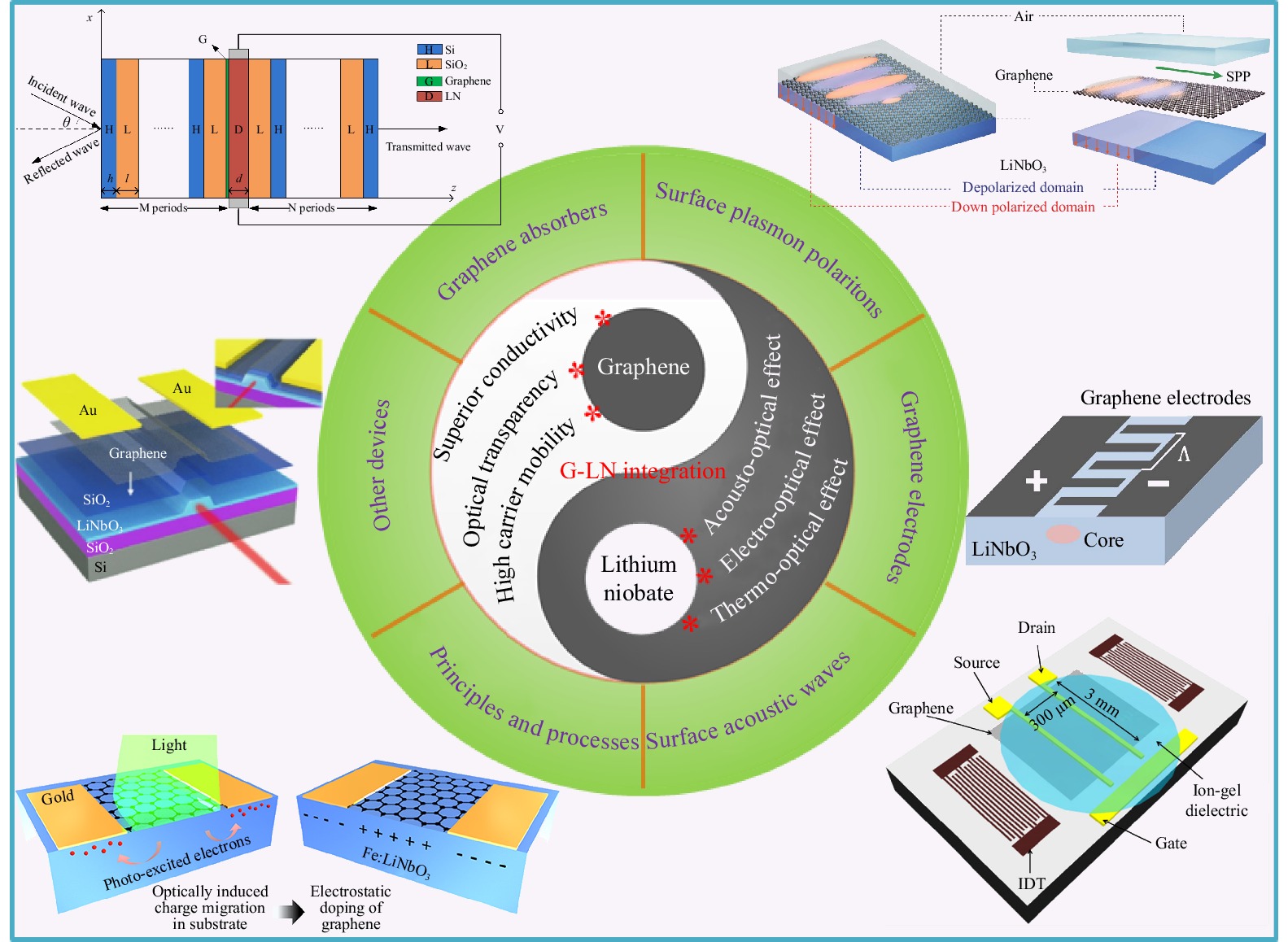 Graphene-lithium niobate (G-LN) integration has emerged as a promising approach for advancing acoustoelectric, photonic, and optic devices. This hybrid integration leverages graphene’s remarkable optical transparency, excellent conductivity, high carrier mobility, tunable electronic properties, and compatibility with complementary metal oxide semiconductor technology, alongside LN’s high electro-optic, acousto-optic, and nonlinear-optic coefficients, creating a highly functional platform for novel devices. This mini-review comprehensively synthesizes the state-of-the-art and recent advancements in G-LN integration, summarizing its fundamental principles and processes of practical fabrication techniques, and exploring surface acoustic waves, graphene electrodes, surface plasmon polaritons, and graphene absorbers. This mini-review of G-LN integration could underscore its significance in supporting more robust, energy-efficient, high-performance, and uniquely diverse devices, implying its potential to drive breakthroughs across multiple disciplines, as well as inspire further advancements in G-LN integration-based device design and applications.