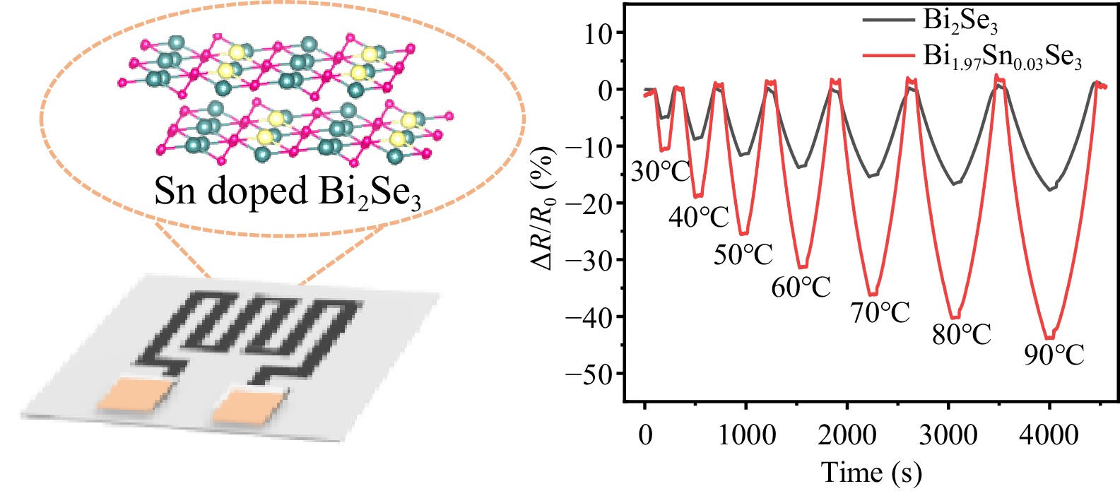Flexible temperature sensors capable of simultaneously delivering high sensitivity, precision, and stability are essential to meet the increasing demands for monitoring temperature changes associated with infections and diseases. Herein, we fabricated a flexible temperature sensor using Bi2Se3-based thermosensitive materials. Through Sn-doping, an n-type to p-type transition was realized in Bi2Se3 nanosheets, leading to enhanced temperature sensing performance. The Bi1.97Sn0.03Se3 nanosheets with optimal doping level exhibited a high sensitivity of –0.63%/°C. The fabricated temperature sensor could detect skin temperature with high precision and stability. Moreover, by taking advantage of the n–p transition, a flexible double-chain thermoelectric generator consisting of n-type Bi2Se3 and p-type Bi1.97Sn0.03Se3 was also fabricated, demonstrating its potential for thermal energy harvesting and self-powered temperature sensing.