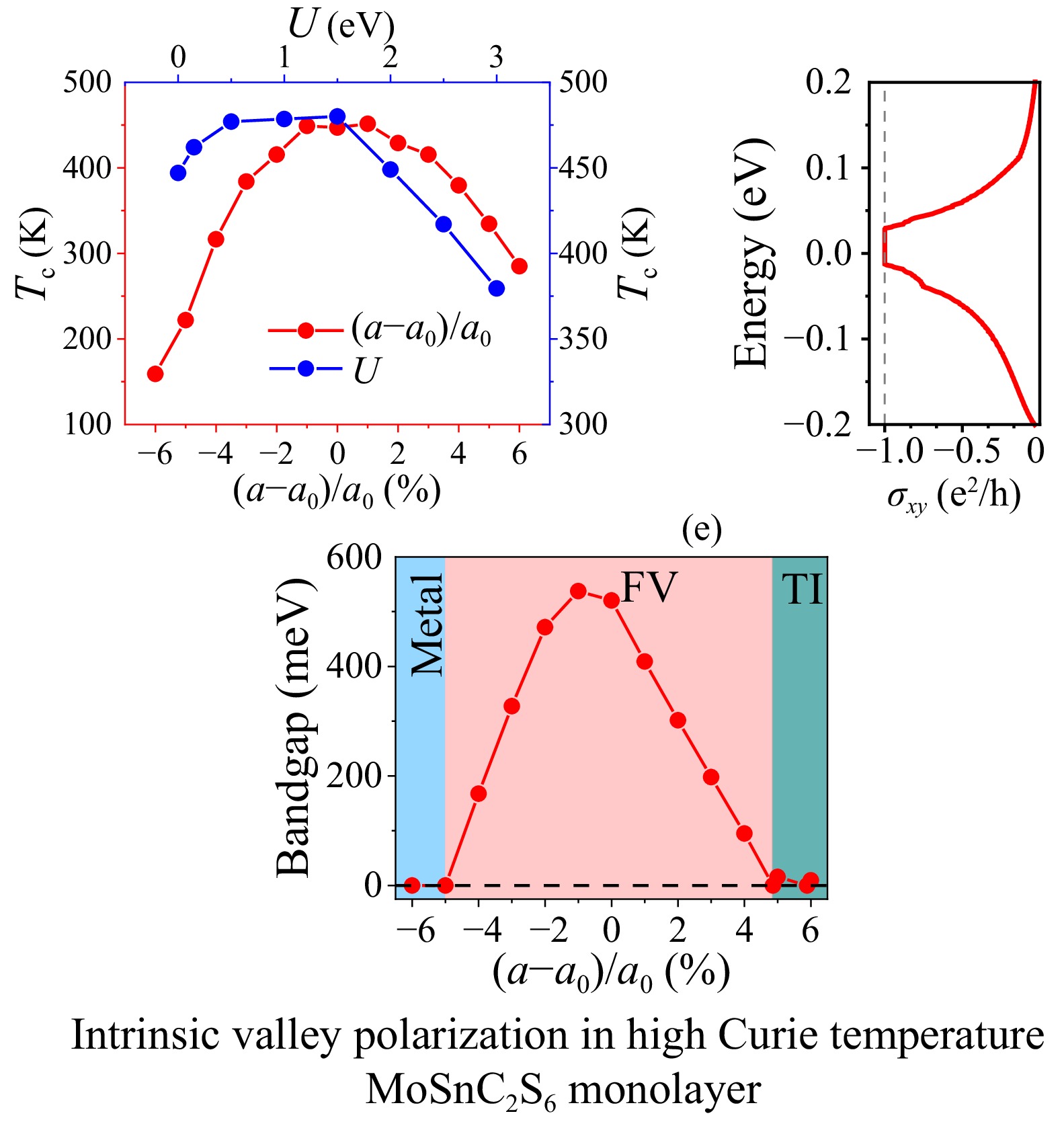 The ferrovalley materials and their nontrivial band topological properties have recently attracted extensive interest in theoretical physics and their promising applications. Using first-principles calculations, we predict the valley polarization in monolayer MoSnC2S6 and MoPbGe2Te6. These materials possess a robust ferromagnetic ground state, with high Curie temperatures of 460 K and 319.5 K, respectively. The intrinsic valley polarization arises from the breaking of time-reversal symmetry and spatial inversion symmetry. Biaxial strain and electron correlation (U) can modulate the valley polarization and bandgap. The quantum anomalous Hall phase is driven by biaxial strain and U during the process of bandgap closing, opening, reclosing, and reopening. This can be demonstrated by the chiral edge states at the edges and the plateau in the anomalous Hall conductivity. During the closing and opening of the bandgap, the sign and magnitude of the Berry curvature also vary. Our work provides an ideal platform for valleytronics and the quantum anomalous Hall effect.