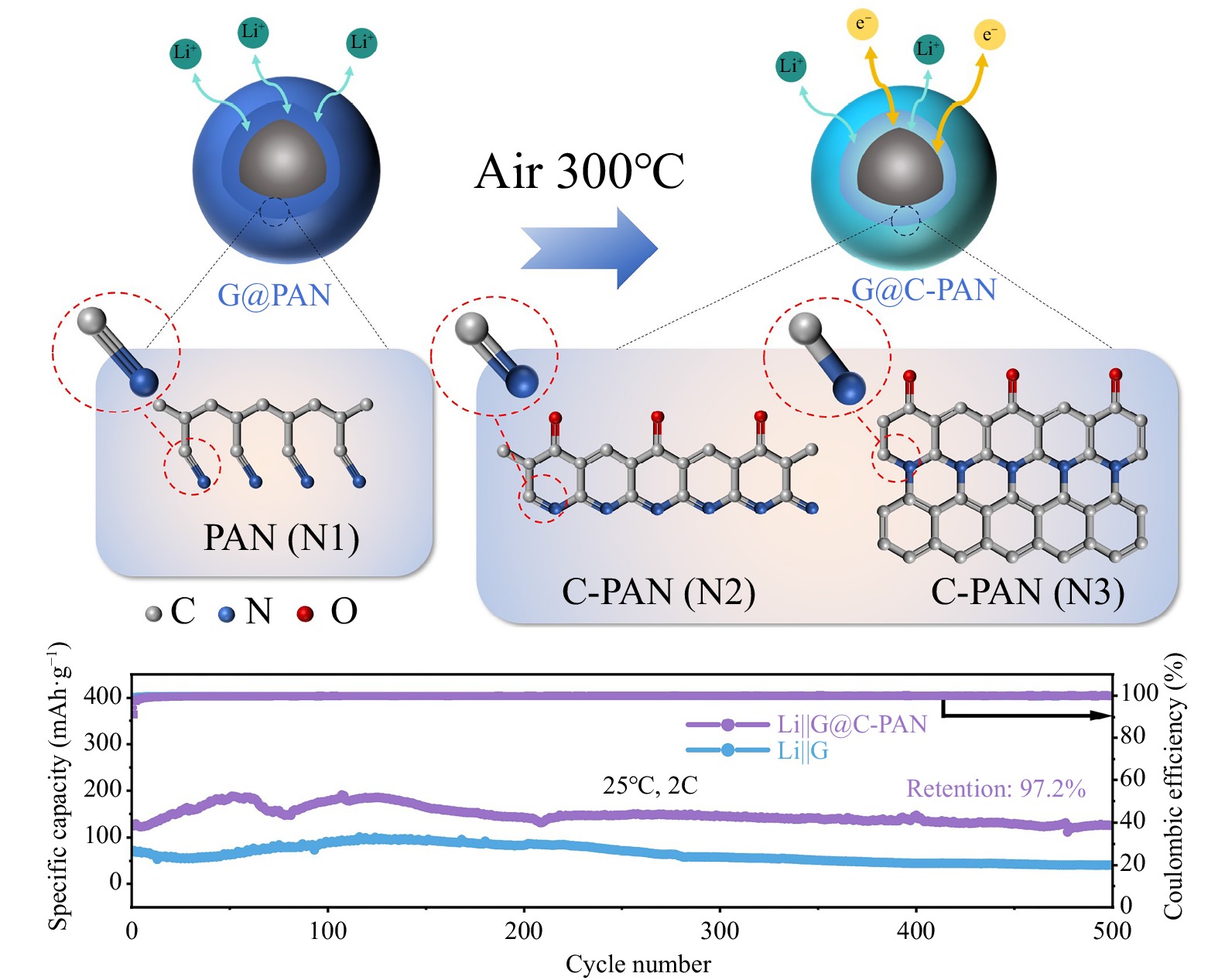 Graphite serves as a pivotal anode material in lithium-ion batteries. However, issues such as the co-embedding of solvent molecules during cycling and rapid capacity degradation at high rates have greatly hampered the practical application and development of graphite materials. Herein, this study proposes a straightforward, cost-effective, and environmentally benign strategy for modifying graphite anodes, with the dual objectives of enhancing high-rate capability and prolonging cycle life. Using water as the primary solvent and polyacrylonitrile as the coating material, a highly conductive, flexible, and strongly bonded polymer cladding layer is designed by combining solid−liquid coating and low-temperature heat treatment technologies. This innovative design not only effectively prevents the co-embedding of solvent molecules and mitigates the volume change of graphite particles during extended cycling, but also successfully constructs a dense and efficient electron transport network on the graphite surface. Leveraging the stability advantages brought by the high electron cloud overlap of C=N bonds (comprising σ bonds and π bonds), the conductivity and structural stability of the material are enhanced. This ultimately results in the successful synthesis of the G@C-PAN core−shell material, which exhibits high-rate performance and exceptional long-cycling stability. The results indicate that the material retains a high specific capacity of 328.12 mAh·g−1 with 96.18% capacity retention after 250 cycles at 0.5C. Furthermore, it exhibits an impressive specific capacity retention of 97.20% after 500 cycles at 2C. This study presents a sustainable, economically viable, and scalable approach for commercializing high-performance graphite-based lithium-ion batteries.