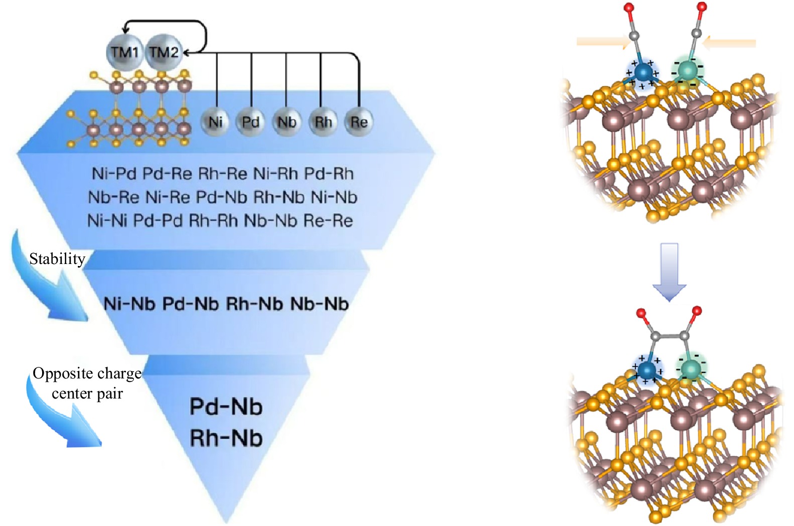 The development of efficient catalysts for the electrocatalytic CO reduction reaction toward high-value C2 products is critical for addressing pressing energy and environmental challenges. Dual-metal catalysts have emerged as promising candidates due to their potential to facilitate C−C coupling, a key step in C2 product formation. However, their activity and selectivity are highly dependent on the charge states of the active sites. Modulating asymmetric charge distribution between metal centers offers a viable strategy to enhance C−C coupling efficiency and product selectivity. In this study, we employ density functional theory to investigate heteronuclear dual-atom catalysts (DACs) anchored on ferroelectric In2Se3 and impact of polarization on charge states of metal sites. We find that Pd−Nb and Rh−Nb DACs form spatially separated charge centers with opposite signs, which significantly reduce the energy barrier for C−C coupling compared to homonuclear Nb−Nb DACs, enabling thermodynamically favorable C−C bond formation. The Coulomb interaction between oppositely charged centers is identified as a key descriptor governing C−C coupling efficiency. Furthermore, ferroelectric polarization switching of In2Se3 offers dynamic modulation of reaction pathways and product selectivity. Pd−Nb@In2Se3 under downward polarization (P↓) favors ethane formation with a limiting potential of −1.06 eV, whereas upward polarization (P↑) shifts the reaction toward an alternative C−C coupling pathway with a higher overpotential (−1.47 eV). Similarly, Rh−Nb@In2Se3 selectively produces ethanol under P↓, but methane under P↑. Importantly, both Pd−Nb and Rh−Nb DACs exhibit stronger CO adsorption than H adsorption, favoring CORR over the competing hydrogen evolution reaction. These findings underscore the potential of ferroelectric DACs as tunable and selective catalysts for CORR, offering a compelling strategy for the rational design of next-generation electrocatalysts for decarbonization.