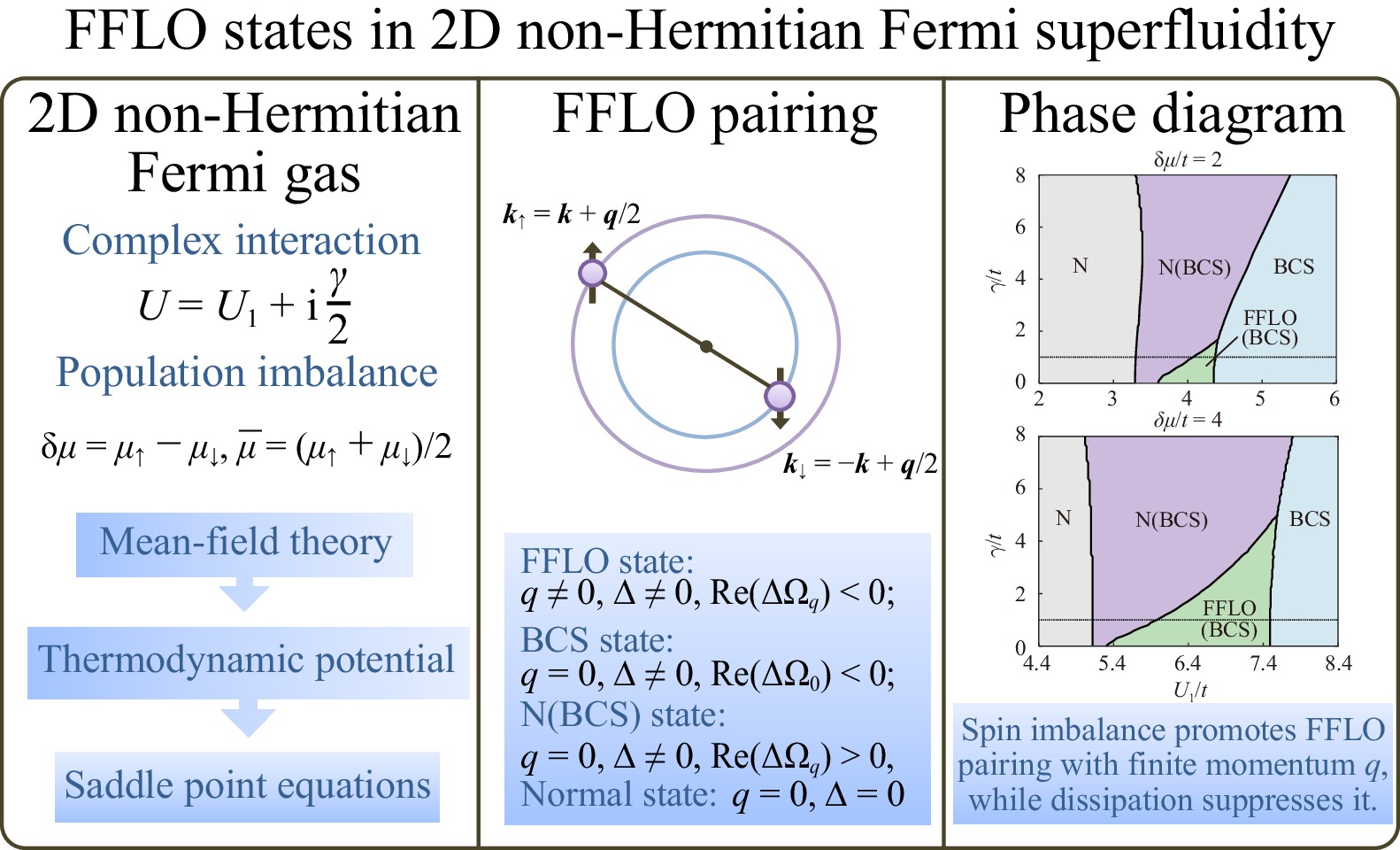 We investigate a two-dimensional non-Hermitian Fermi system with spin imbalance and dissipative interaction. We employ the mean-field approximation to derive and minimize the thermodynamic potential, and determine the zero-temperature phase diagram upon variation of imbalance and dissipation. Notably, we identify a Fulde−Ferrell−Larkin−Ovchinnikov (FFLO) state characterized by a pairing order parameter with finite center-of-mass momentum, along with the normal, Bardeen−Cooper−Schrieffer (BCS), and metastable BCS states. The FFLO state is favored with increasing spin imbalance but diminishes and eventually disappears with elevated dissipation. Additionally, we present the quasiparticle energy spectrum and momentum distribution, highlighting the spatial asymmetry features that can be used to deterministically identify the FFLO state.