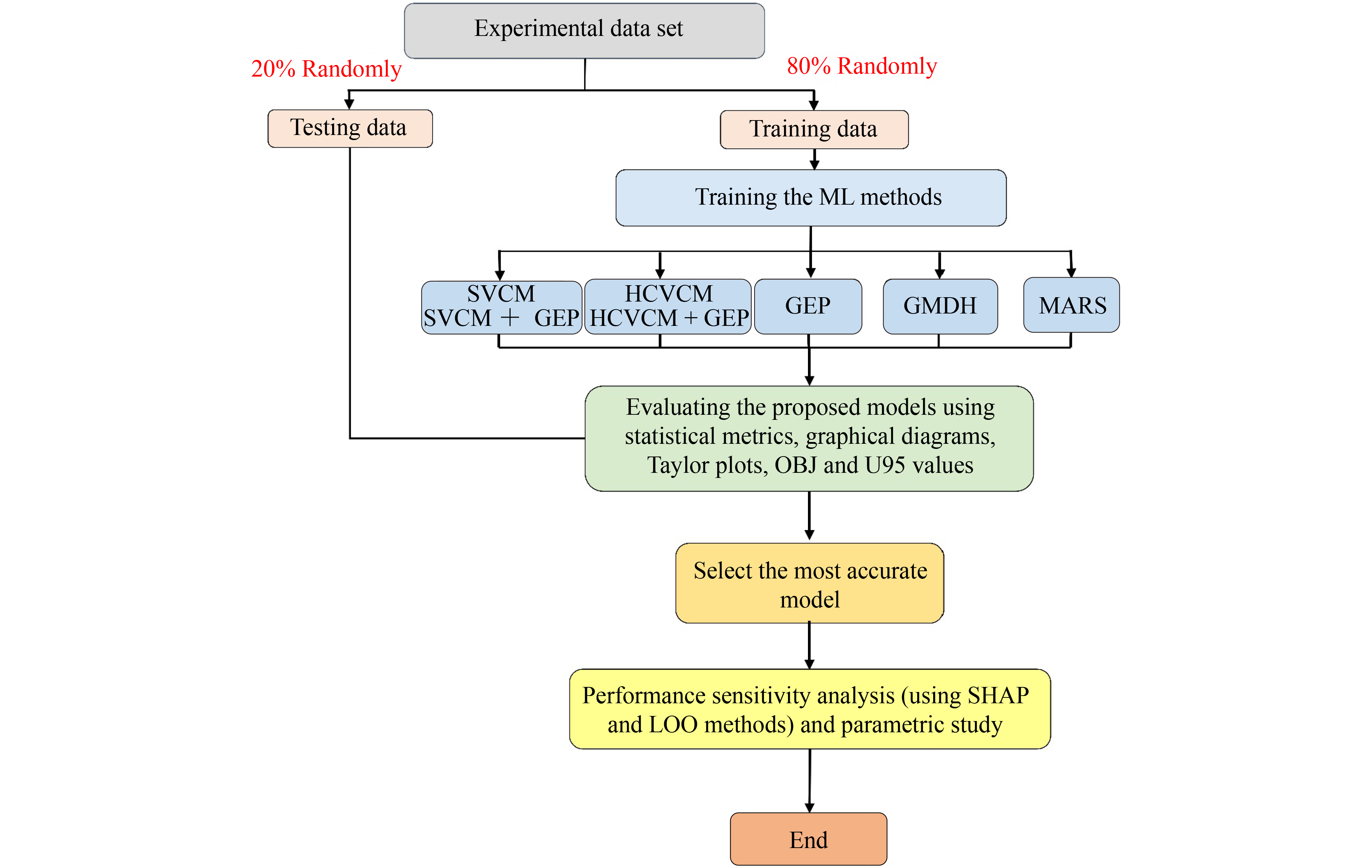 The main purpose of this investigation is to assess and compare the effectiveness of white-box data-driven techniques such as GEP, GMDH, MARS, SVCM, and HCVCM, as well as to ensemble models, which are the ensemble of SVCM and GEP, as well as HCVCM and GEP in prediction the CS of HSC. The second aim of this investigation concerns the use of new ML methods to present more reliable and accurate models to estimate the CS of HSC. The focus of this research is on employing white-box data-driven techniques to formulate precise equations for modeling the CS, incorporating the physical properties of hydrothermally solidified clay. In conclusion, a comparative analysis was performed to assess the capability of the proposed data-driven methods, with the results being measured using statistical metrics and graphical representations. Figure 1 illustrates the arrangement of steps of this investigation. It is worth noting that the data split was conducted randomly.