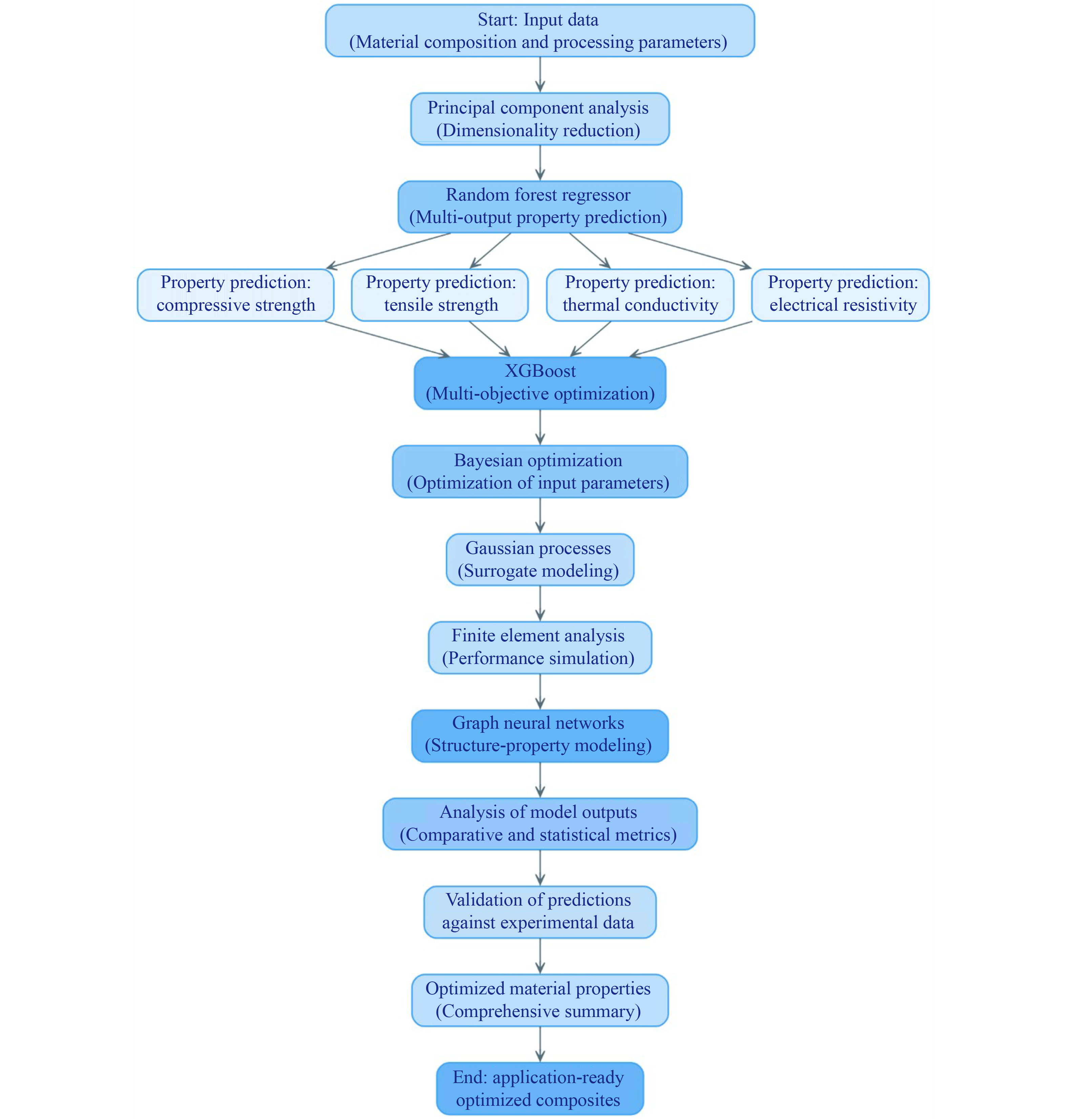 The multi-output prediction and optimization framework of machine learning was developed for key performance properties, namely compressive strength, thermal conductivity, and electrical resistivity, of multi-functional NECs. The pipeline structure consisted initially of dimensionality reduction using PCA, followed by training of the subsequent model using RFR for the prediction model and XGBoost for the multi-objective optimization of the regressors. The structure-property relations were modeled using GNNs capturing the influence of nanoparticle dispersion on macroscopic properties. Surrogate models of GPs were created to simulate finite element analysis outputs, reducing computations.