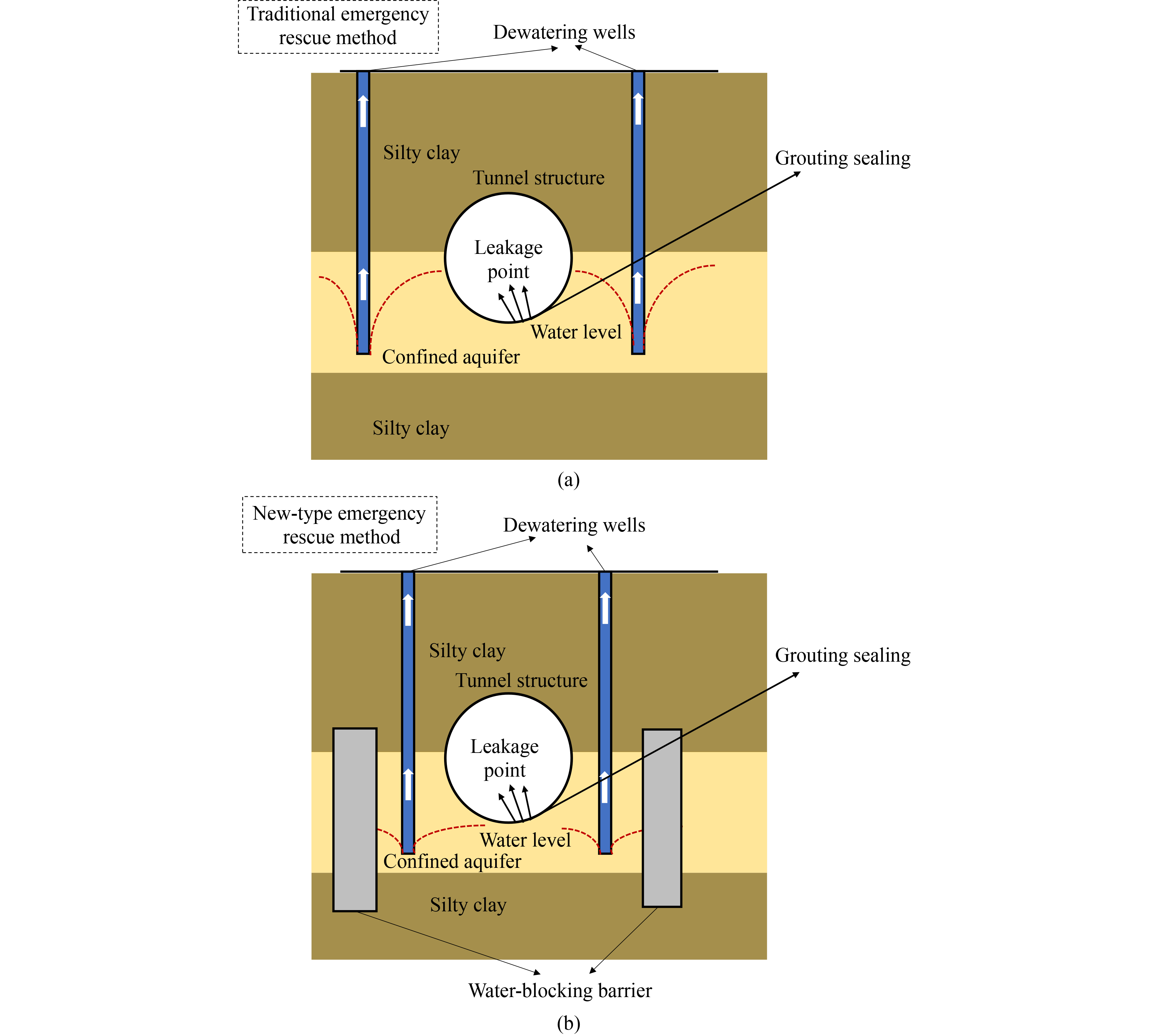 13]. Nevertheless, as shown in Fig. 1(a), the traditional dewatering method suffered from low efficiency due to the continuous replenishment of water from the distant water level. Moreover, it was difficult to maintain a low water level at the leakage point for an extended period [