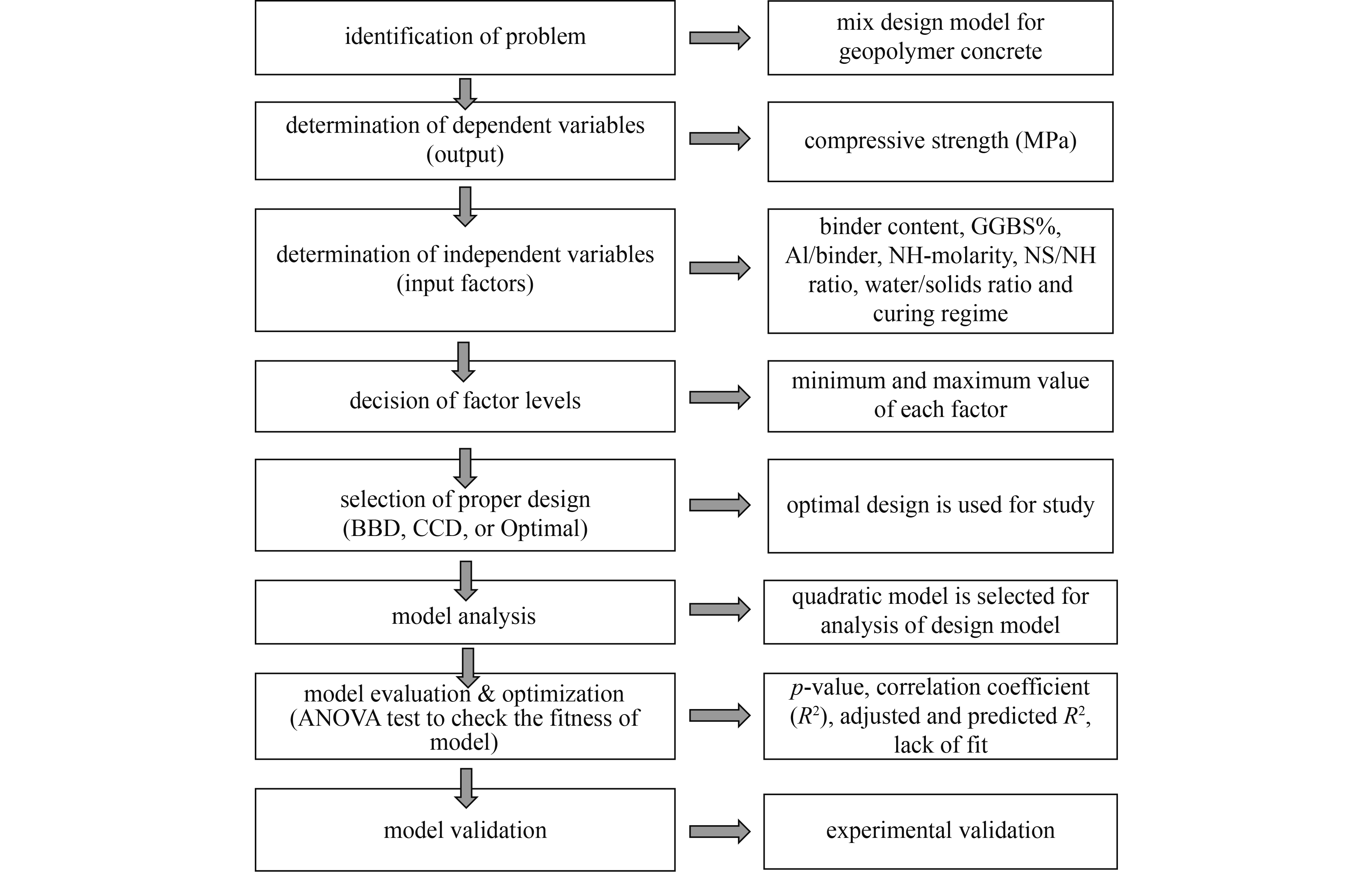 The present study proposes the mix design method of Fly Ash (FA) based geopolymer concrete using Response Surface Methodology (RSM). In this method, different factors, including binder content, alkali/binder ratio, NS/NH ratio (sodium silicate/sodium hydroxide), NH molarity, and water/solids ratio were considered for the mix design of geopolymer concrete. The 2D contour plots were used to setup the mix design method to achieve the target compressive strength. The proposed mix design method of geopolymer concrete is divided into three categories based on curing regime, specifically one ambient curing (25 °C) and two heat curing (60 and 90 °C). The proposed mix design method of geopolymer concrete was validated through experimentation of M30, M50, and M70 concrete mixes at all curing regimes. The observed experimental compressive strength results validate the mix design method by more than 90% of their target strength. Furthermore, the current study concluded that the required compressive strength can be achieved by varying any factor in the mix design. In addition, the factor analysis revealed that the NS/NH ratio significantly affects the compressive strength of geopolymer concrete.