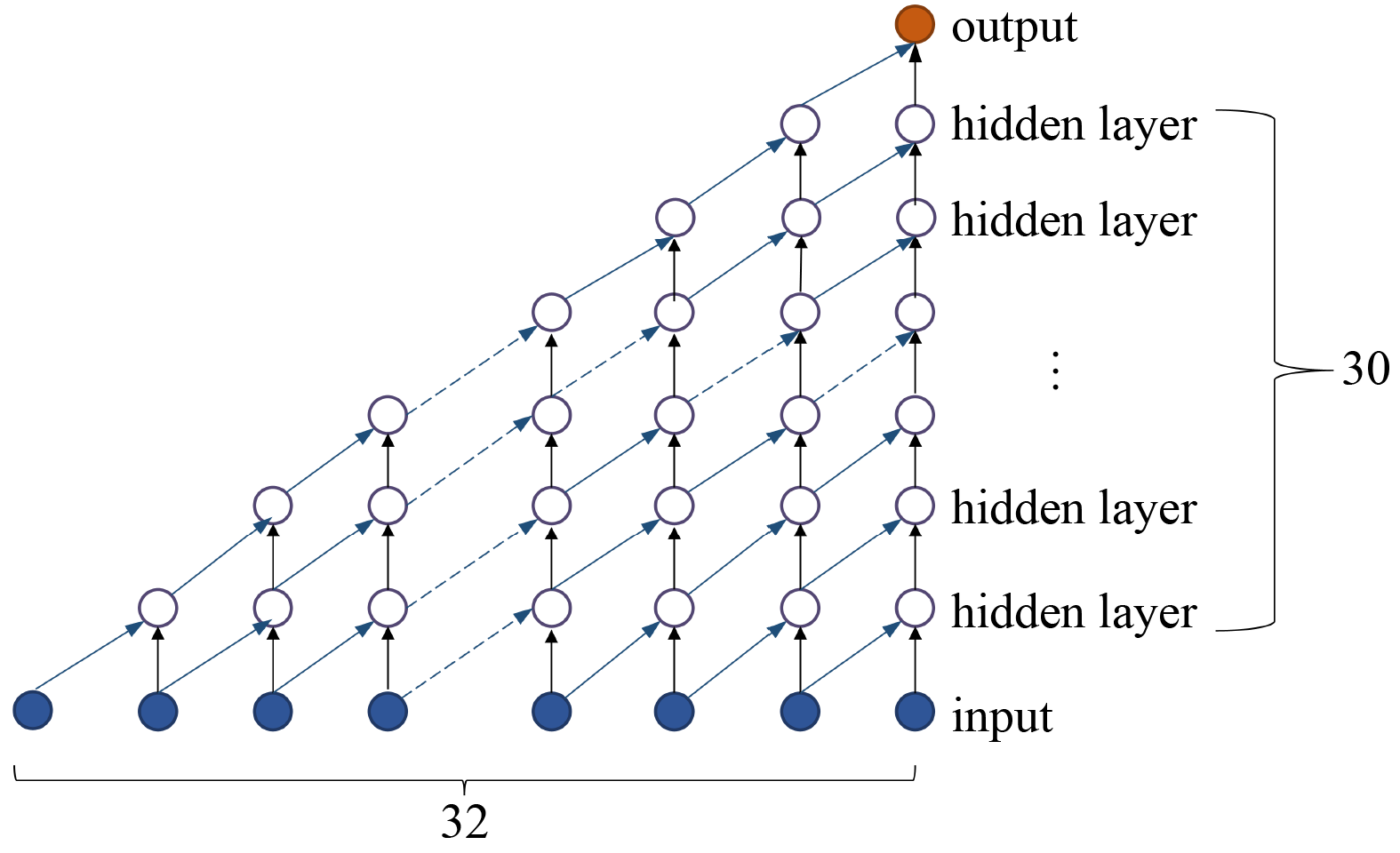 Real-time dynamic adjustment of the tunnel bore machine (TBM) advance rate according to the rock-machine interaction parameters is of great significance to the adaptability of TBM and its efficiency in construction. This paper proposes a real-time predictive model of TBM advance rate using the temporal convolutional network (TCN), based on TBM construction big data. The prediction model was built using an experimental database, containing 235 data sets, established from the construction data from the Jilin Water-Diversion Tunnel Project in China. The TBM operating parameters, including total thrust, cutterhead rotation, cutterhead torque and penetration rate, are selected as the input parameters of the model. The TCN model is found outperforming the recurrent neural network (RNN) and long short-term memory (LSTM) model in predicting the TBM advance rate with much smaller values of mean absolute percentage error than the latter two. The penetration rate and cutterhead torque of the current moment have significant influence on the TBM advance rate of the next moment. On the contrary, the influence of the cutterhead rotation and total thrust is moderate. The work provides a new concept of real-time prediction of the TBM performance for highly efficient tunnel construction.