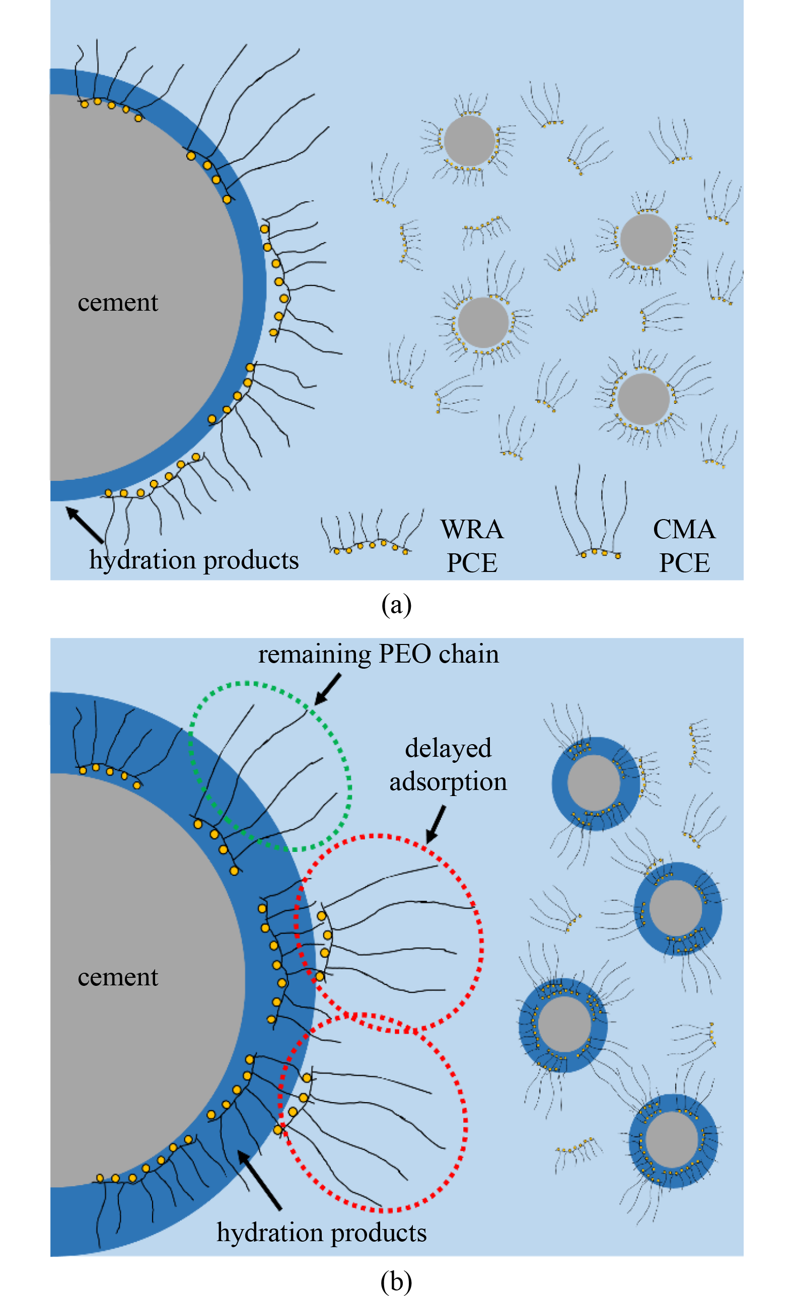 The cement dispersion performance of a polycarboxylate (PCE)-based superplasticizer is highly related to their adsorption behaviors as a function of time. This study evaluated effects of PCEs on rheological properties of cementitious materials. First, characteristics of PCEs were characterized via permeation chromatography (GPC) and Fourier-transform infrared spectrometry (FT-IR). The adsorption behavior of single and blended PCEs on cementitious composites was identified using total organic carbon analyzer (TOC). Based on the measurement of PCE adsorption, the changes of rheological properties of cementitious materials as well as the number of dispersed cement particles were characterized using a rheometer and laser spectroscopy, respectively. The experimental results support the systematic mechanism of PCE adsorption, cement dispersion, and the decrease in viscosity of cementitious materials.