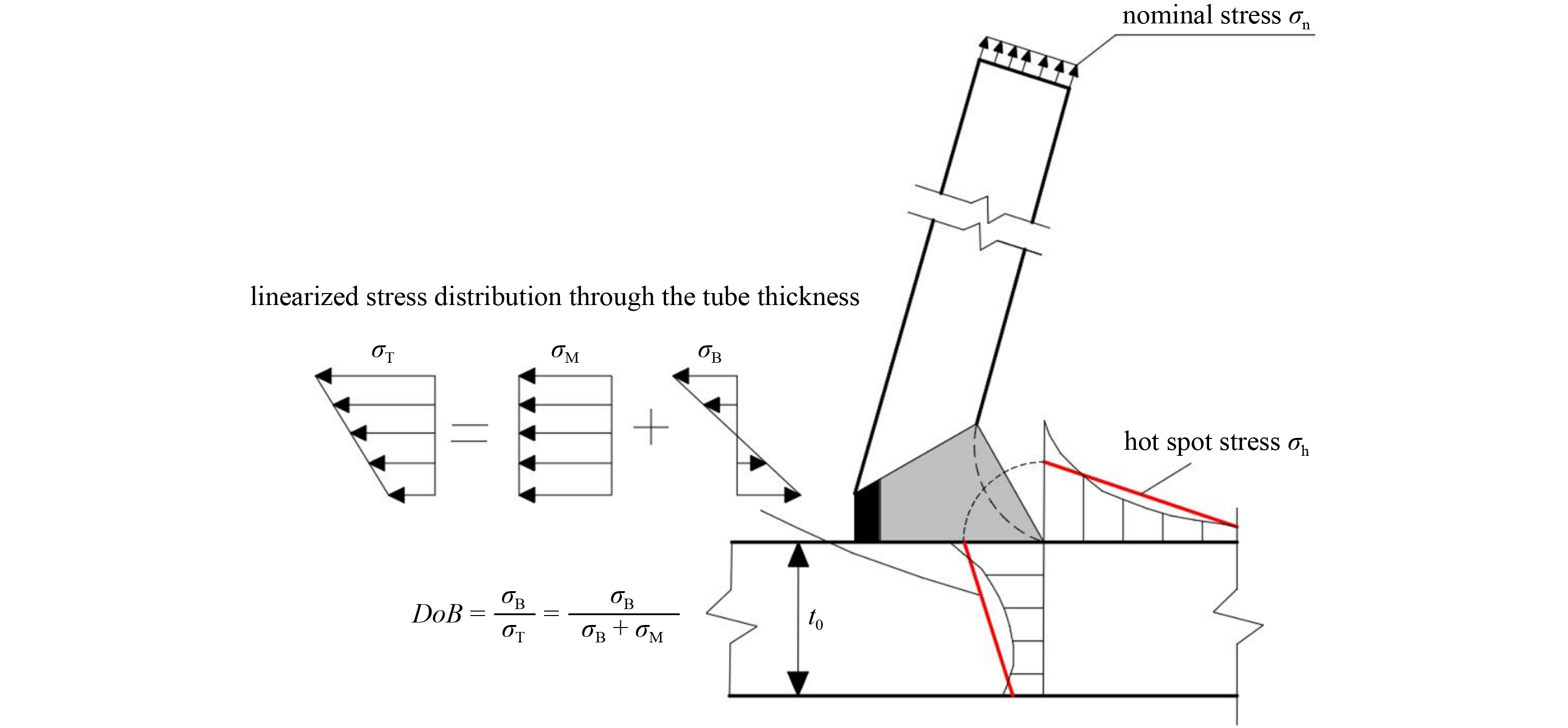 It has been found that the fatigue life of tubular joints is not only determined by the hot spot stress, but also by the stress distribution through the tube thickness represented as the degree of bending (DoB). Consequently, the DoB value should be determined to improve the accuracy of fatigue assessment for both stress-life curve and fracture mechanics methods. Currently, no DoB parametric formula is available for concrete-filled rectangular hollow section (CFRHS) K-joints, despite their wide use in bridge engineering. Therefore, a robust finite element (FE) analysis was carried out to calculate the DoB of CFRHS K-joints under balanced-axial loading. The FE model was developed and verified against a test result to ensure accuracy. A comprehensive parametric study including 190 models, was conducted to establish the relationships between the DoBs and four specific variables. Based on the numerical results, design equations to predict DoBs for CFRHS K-joints were proposed through multiple regression analysis. A reduction of 37.17% was discovered in the DoB, resulting in a decrease of 66.85% in the fatigue life. Inclusively, the CFRHS K-joints with same hot spot stresses, may have completely different fatigue lives due to the different DoBs.