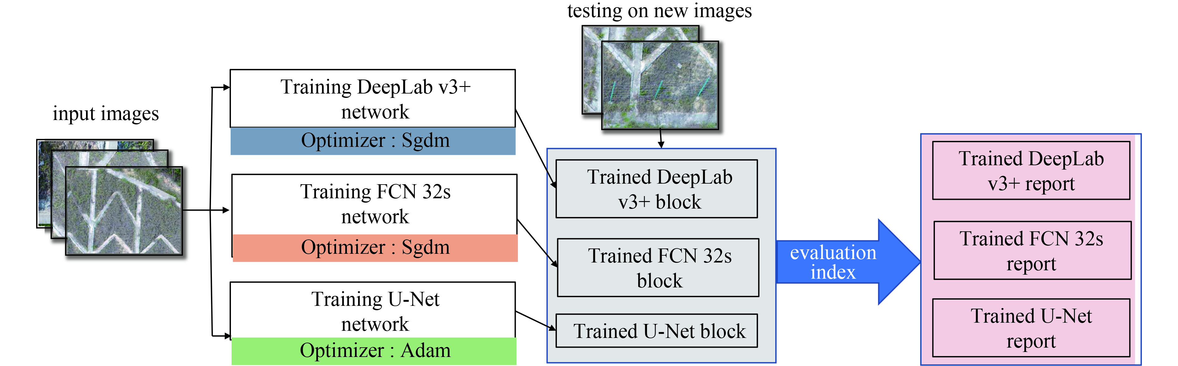 This paper utilizes three popular semantic segmentation networks, specifically DeepLab v3+, fully convolutional network (FCN), and U-Net to qualitively analyze and identify the key components of cutting slope images in complex scenes and achieve rapid image-based slope detection. The elements of cutting slope images are divided into 7 categories. In order to determine the best algorithm for pixel level classification of cutting slope images, the networks are compared from three aspects: a) different neural networks, b) different feature extractors, and c) 2 different optimization algorithms. It is found that DeepLab v3+ with Resnet18 and Sgdm performs best, FCN 32s with Sgdm takes the second, and U-Net with Adam ranks third. This paper also analyzes the segmentation strategies of the three networks in terms of feature map visualization. Results show that the contour generated by DeepLab v3+ (combined with Resnet18 and Sgdm) is closest to the ground truth, while the resulting contour of U-Net (combined with Adam) is closest to the input images.