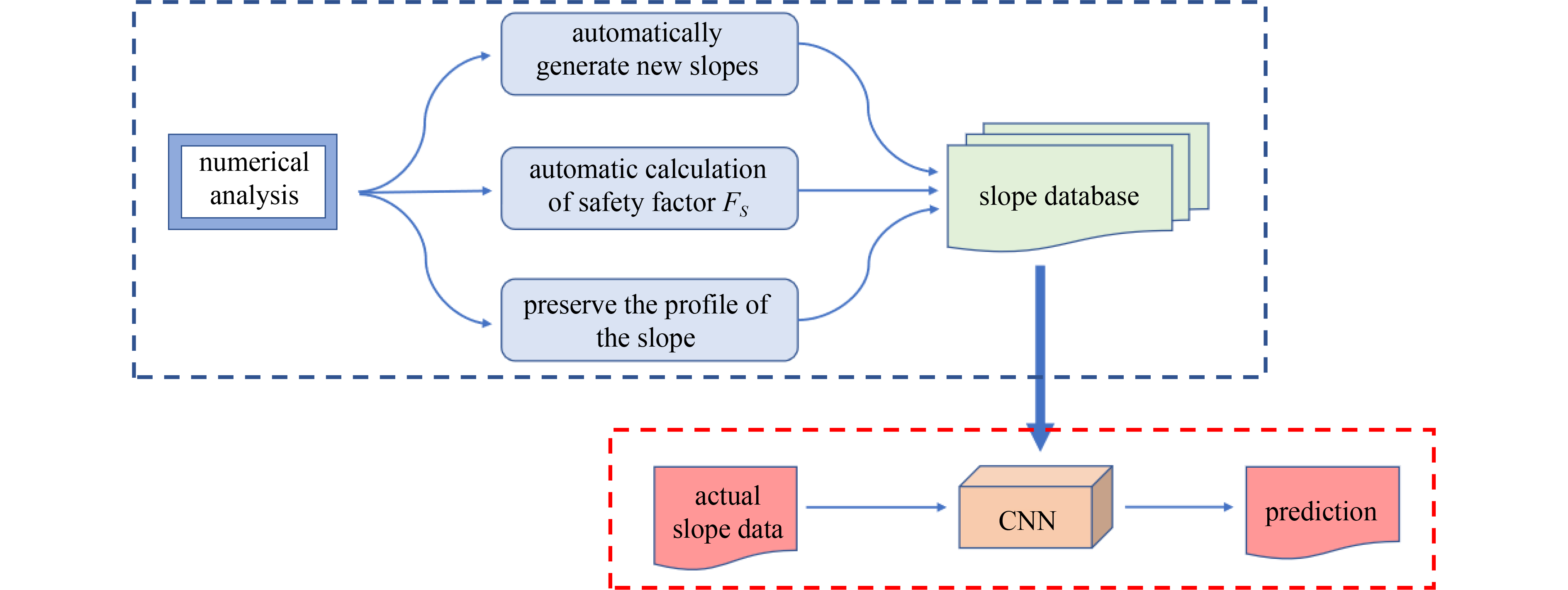 The Limit Equilibrium Method (LEM) is commonly used in traditional slope stability analyses, but it is time-consuming and complicated. Due to its complexity and nonlinearity involved in the evaluation process, it cannot provide a quick stability estimation when facing a large number of slopes. In this case, the convolutional neural network (CNN) provides a better alternative. A CNN model can process data quickly and complete a large amount of data analysis in a specific situation, while it needs a large number of training samples. It is difficult to get enough slope data samples in practical engineering. This study proposes a slope database generation method based on the LEM. Samples were amplified from 40 typical slopes, and a sample database consisting of 20000 slope samples was established. The sample database for slopes covered a wide range of slope geometries and soil layers’ physical and mechanical properties. The CNN trained with this sample database was then applied to the stability prediction of 15 real slopes to test the accuracy of the CNN model. The results show that the slope stability prediction method based on the CNN does not need complex calculation but only needs to provide the slope coordinate information and physical and mechanical parameters of the soil layers, and it can quickly obtain the safety factor and stability state of the slopes. Moreover, the prediction accuracy of the CNN trained by the sample database for slope stability analysis reaches more than 99%, and the comparisons with the BP neural network show that the CNN has significant superiority in slope stability evaluation. Therefore, the CNN can predict the safety factor of real slopes. In particular, the combination of typical actual slopes and generated slope data provides enough training and testing samples for the CNN, which improves the prediction speed and practicability of the CNN-based evaluation method in engineering practice.