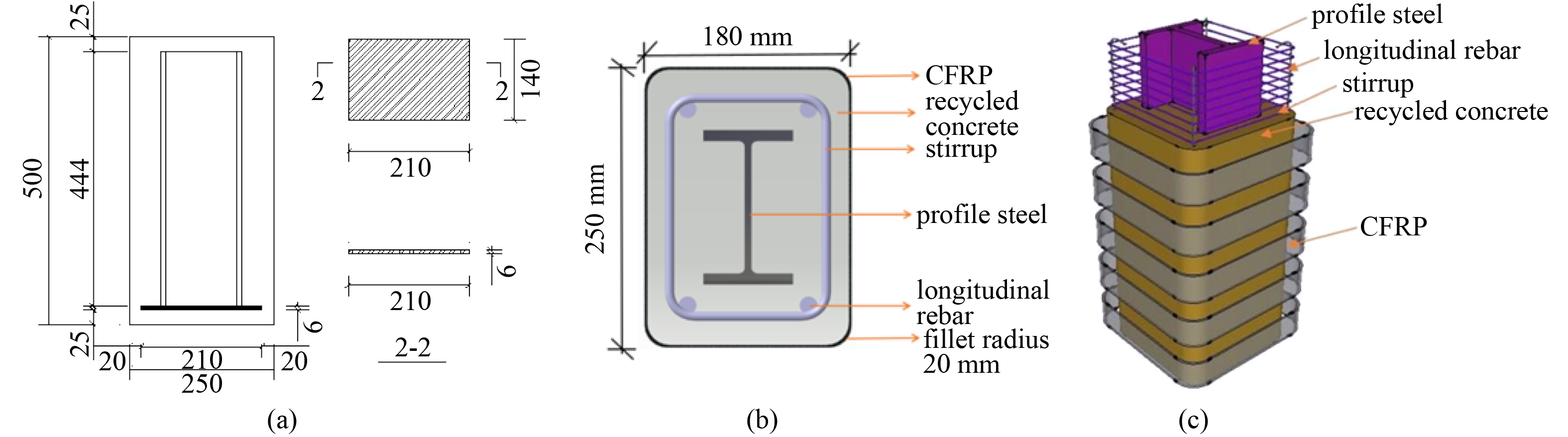 To research the axial compression behavior of steel reinforced recycled concrete (SRRC) short columns confined by carbon fiber reinforced plastics (CFRP) strips, nine scaled specimens of SRRC short columns were fabricated and tested under axial compression loading. Subsequently, the failure process and failure modes were observed, and load-displacement curves as well as the strain of various materials were analyzed. The effects on the substitution percentage of recycled coarse aggregate (RCA), width of CFRP strips, spacing of CFRP strips and strength of recycled aggregate concrete (RAC) on the axial compression properties of columns were also analyzed in the experimental investigation. Furthermore, the finite element model of columns which can consider the adverse influence of RCA and the constraint effect of CFRP strips was founded by ABAQUS software and the nonlinear parameter analysis of columns was also implemented in this study. The results show that the first to reach the yield state was the profile steel in the columns, then the longitudinal rebars and stirrups yielded successively, and finally RAC was crushed as well as the CFRP strips was also broken. The replacement rate of RCA has little effect on the columns, and with the substitution rate of RCA from 0 to 100%, the bearing capacity of columns decreased by only 4.8%. Increasing the CFRP strips width or decreasing the CFRP strips spacing could enhance the axial bearing capacity of columns, the maximum increase was 10.5% or 11.4%, and the ductility of columns was significantly enhanced. Obviously, CFRP strips are conducive to enhance the axial bearing capacity and deformation capacity of columns. On this basis, considering the restraint effect of CFRP strips and the adverse effects of RCA, the revised formulas for calculating the axial bearing capacity of SRRC short columns confined by CFRP strips were proposed.