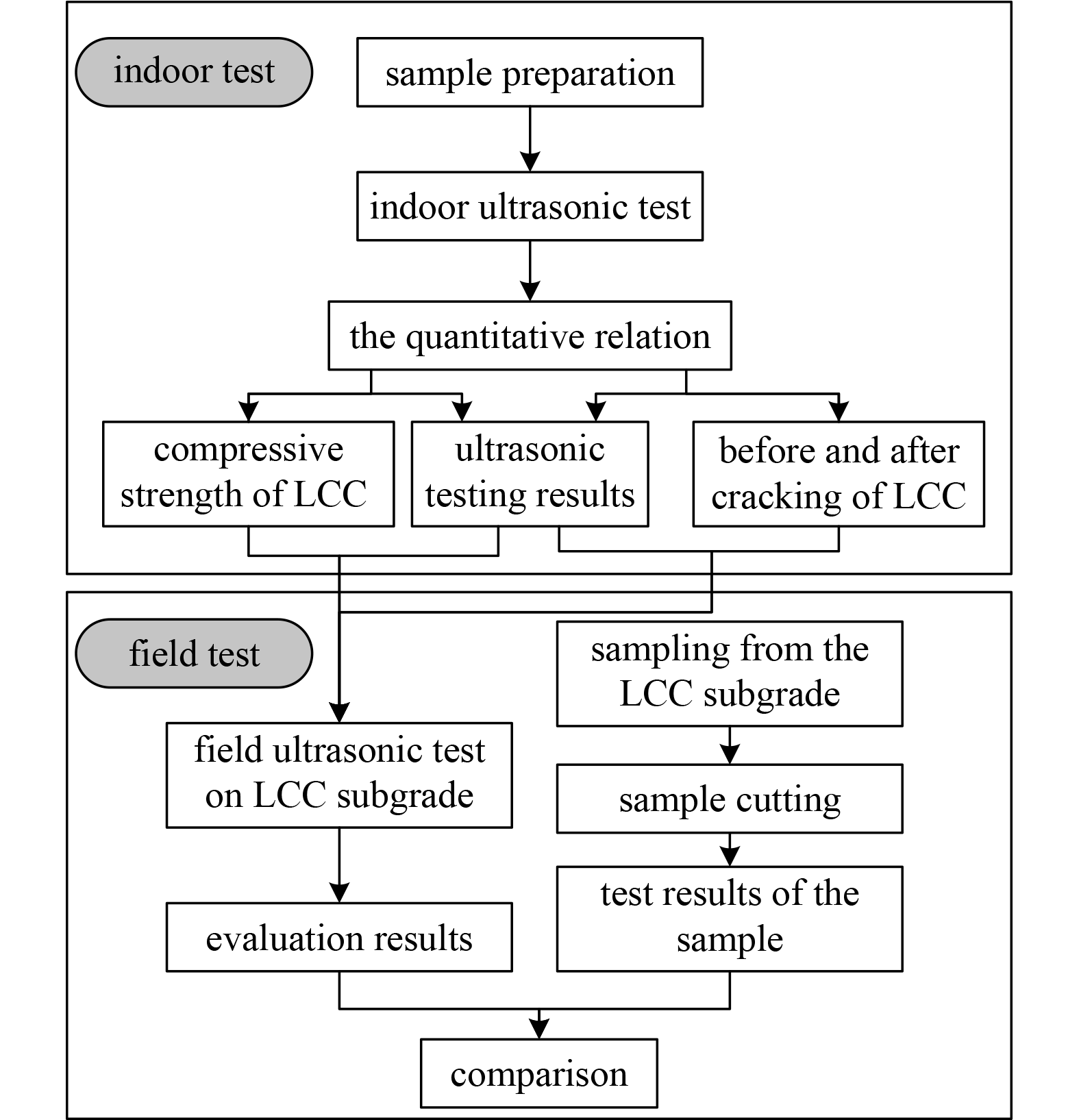 The accuracy of subgrade quality evaluation is important for road safety assessment. Since there is little research work devoted to testing lightweight cellular concrete (LCC) by an ultrasound-based method, the quantitative relation between ultrasonic testing results and the quality of LCC subgrade is not well understood. In this paper, the quality of LCC subgrade was evaluated with respect to compressive strength and crack discrimination. The relation between ultrasonic testing results and LCC quality was explored through indoor tests. Based on the quantitative relation between ultrasonic pulse velocity and compressive strength of LCC, a fitting formula was established. Moreover, after the LCC became cracked, the ultrasonic pulse velocity and ultrasonic pulse amplitude decreased. After determining the lower limiting values of the ultrasonic pulse velocity and ultrasonic pulse amplitude through the statistical data, it could be calculated whether there were cracks in LCC subgrade. The ultrasonic testing results showed that the compressive strength of the LCC subgrade was suitable for purpose and there was no crack in the subgrade. Then core samples were taken from the subgrade. Comparisons between ultrasonic testing results of subgrade and test results of core samples demonstrated a good agreement.
