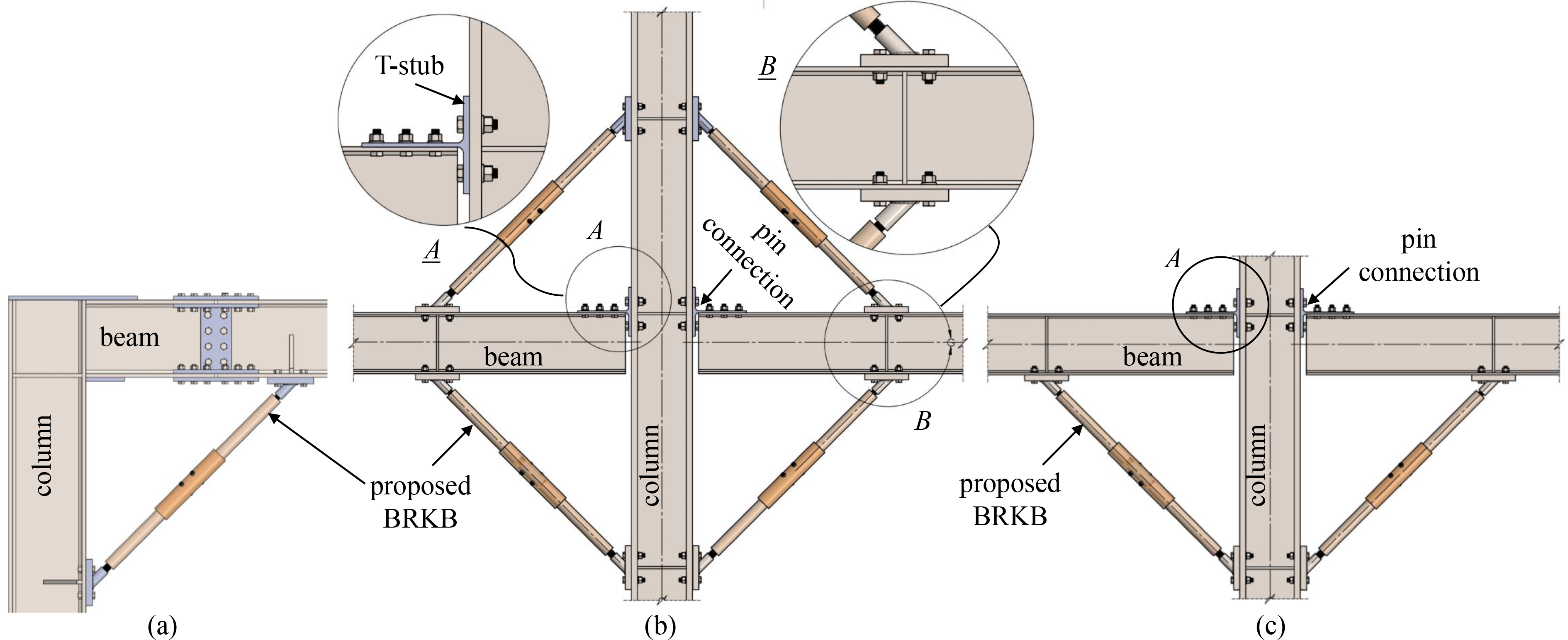 This study aimed to investigate a novel slender buckling-restrained knee brace damper (BRKB) for welded and weld-free steel framing systems. The proposed BRKB adopts steel bar cores connected by a central coupler and restrained by tube buckling restrainers with a cover tube supporter. The advantages of the proposed damper include easy assembly compared to conventional buckling restrained braces, and high architectural flexibility for the retrofitting of large-span weld-free or welded steel moment-resisting systems. Specifically, by increasing the number of contraction allowances, undesirable failure mechanisms that are global instability and local buckling of the restrainer ends can be effectively suppressed because the more uniform plastic deformation of the core bar can be achieved longitudinally. In this study, displacement-controlled compression and cyclic loading tests were carried out to investigate the deformation capacities of the proposed BRKBs. Structural performance metrics associated with both loading tests, such as strength capacities, strains at the cover tubes and buckling restrainers, and hysteretic behaviors of the proposed damper under cyclic loads, were measured and discussed. Test results revealed that the geometrical characteristics of the cover tubes and adopted contraction allowances at the dampers play essential roles in their load-bearing capacities.