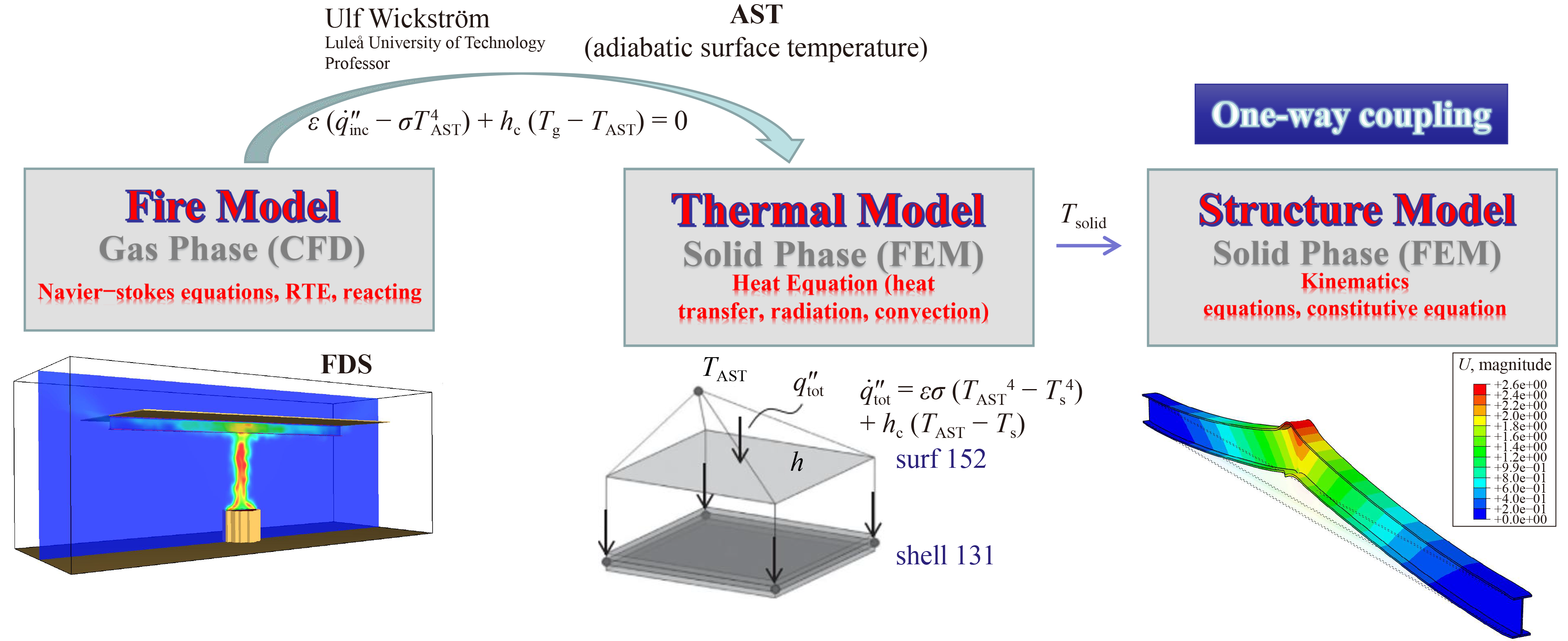 For localized fires, it is necessary to consider the thermal and mechanical responses of building elements subject to uneven heating under the influence of wind. In this paper, the thermomechanical phenomena experienced by a ceiling jet and I-beam in a structural fire were simulated. Instead of applying the concept of adiabatic surface temperature (AST) to achieve fluid–structure coupling, this paper proposes a new computational fluid dynamics–finite element method numerical simulation that combines wind, fire, thermal, and structural analyses. First, to analyze the velocity and temperature distributions, the results of the numerical model and experiment were compared in windless conditions, showing good agreement. Vortices were found in the local area formed by the upper and lower flanges of the I-beam and the web, generating a local high-temperature zone and enhancing the heat transfer of convection. In an incoming-flow scenario, the flame was blown askew significantly; the wall temperature was bimodally distributed in the axial direction. The first temperature peak was mainly caused by radiative heat transfer, while the second resulted from convective heat transfer. In terms of mechanical response, the yield strength degradation in the highest-temperature region in windless conditions was found to be significant, thus explaining the stress distribution of steel beams in the fire field. The mechanical response of the overall elements considering the incoming flows was essentially elastic.