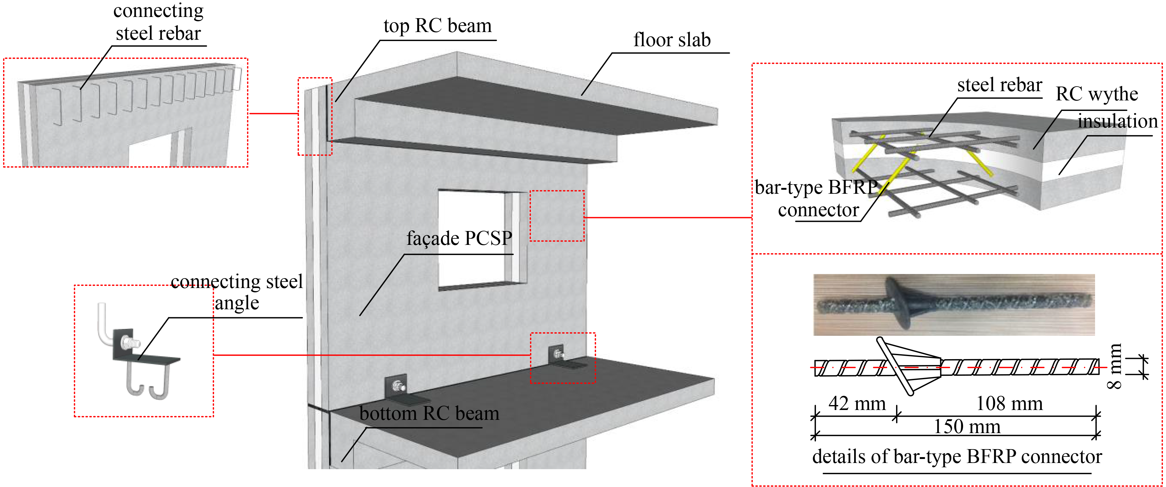 In this study, a novel diagonally inserted bar-type basalt fiber reinforced polymer (BFRP) connector was proposed, aiming to achieve both construction convenience and partially composite behavior in precast concrete sandwich panels (PCSPs). First, pull-out tests were conducted to evaluate the anchoring performance of the connector in concrete after exposure to different temperatures. Thereafter, direct shear tests were conducted to investigate the shear performance of the connector. After the test on the individual performance of the connector, five façade PCSP specimens with the bar-type BFRP connector were fabricated, and the out-of-plane flexural performance was tested under a uniformly distributed load. The investigating parameters included the panel length, opening condition, and boundary condition. The results obtained in this study primarily indicated that 1) the bar-type BFRP connector can achieve a reliable anchorage system in concrete; 2) the bar-type BFRP connector can offer sufficient stiffness and capacity to achieve a partially composite PCSP; 3) the boundary condition of the panel considerably influenced the out-of-plane flexural performance and composite action of the investigated façade PCSP.