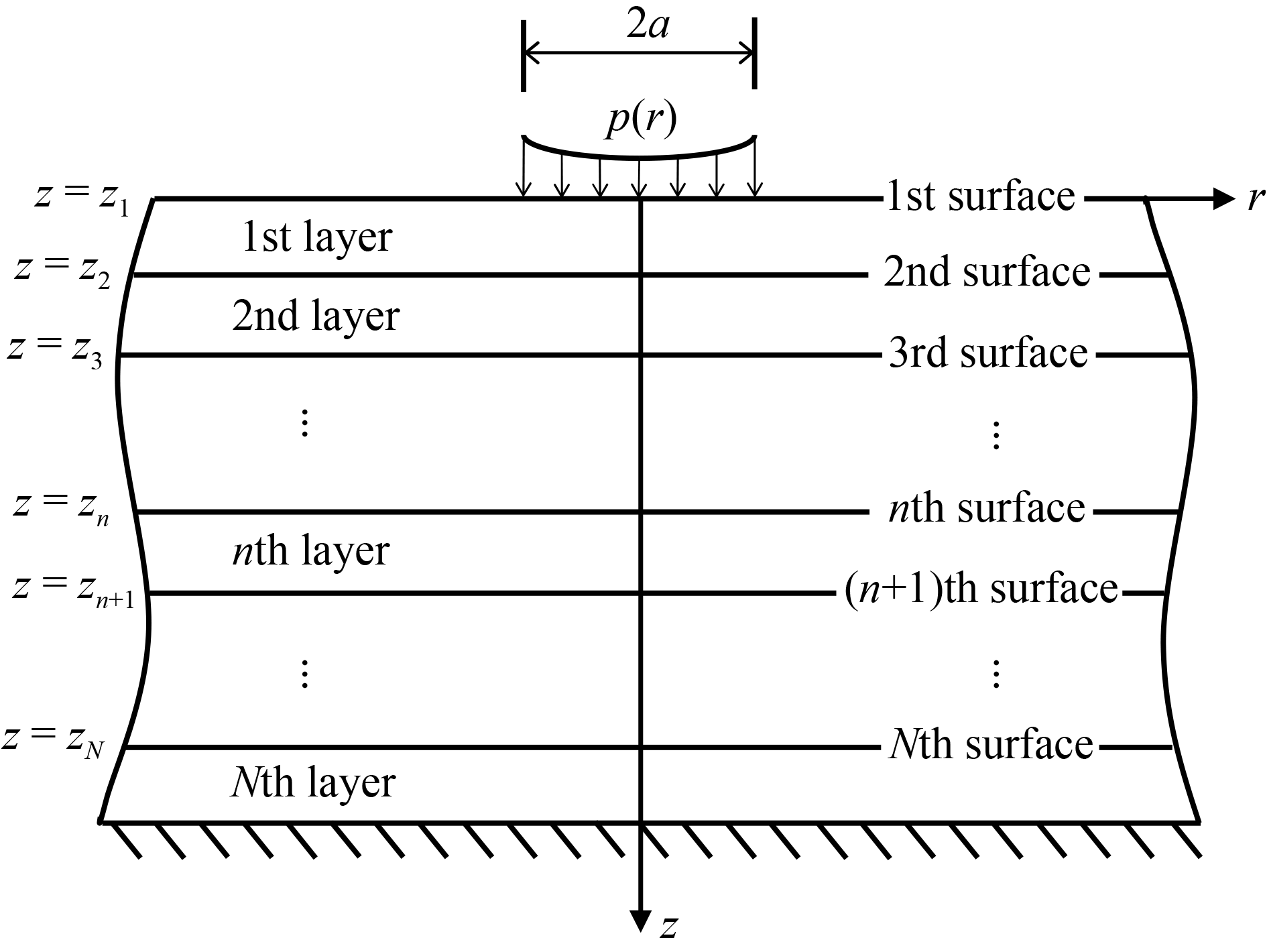 Multilayered nanoscale structures are used in several applications. Because the effect of surface energy becomes nontrivial at such a small scale, a modified continuum theory is required to accurately predict their mechanical behaviors. A Gurtin–Murdoch continuum model of surface elasticity is implemented to establish a computational scheme for investigating an elastic multilayered system under axisymmetric loads with the incorporation of surface/interface energy. Each layer stiffness matrix is derived based on the general solutions of stresses and displacements obtained in the form of the Hankel integral transform. Numerical solutions to the global equation, which are formulated based on the continuity conditions of tractions and displacements across interfaces between layers, yield the displacements at each layer interface and on the top surface of the multilayered medium. The numerical solutions indicate that the elastic responses of multilayered structures are affected significantly by the surface material properties of both the top surface and interfaces, and that they become size dependent. In addition, the indentation problem of a multilayered nanoscale elastic medium under a rigid frictionless cylindrical punch is investigated to demonstrate the application of the proposed solution scheme.