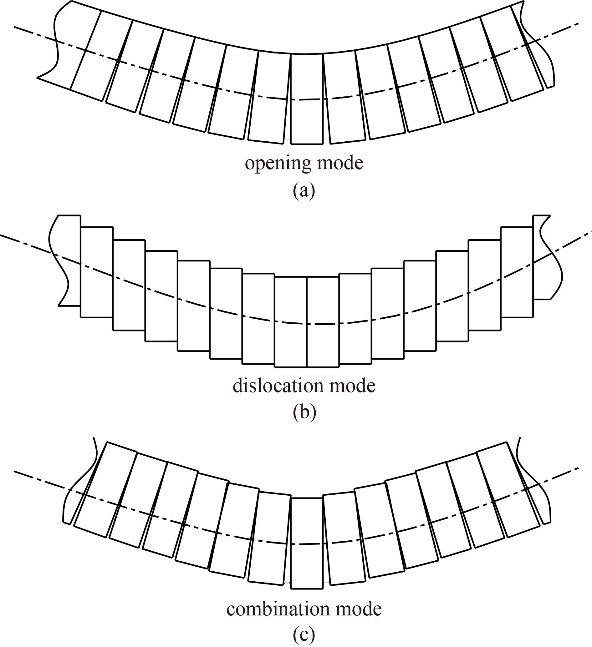 An analytical model is proposed to estimate the discontinuous mechanical behavior of an existing shield tunnel above a new tunnel. The existing shield tunnel is regarded as a Timoshenko beam with longitudinal joints. The opening and relative dislocation of the longitudinal joints can be calculated using Dirac delta functions. Compared with other approaches, our method yields results that are consistent with centrifugation test data. The effects of the stiffness reduction at the longitudinal joints (α and β), the shearing stiffness of the Timoshenko beam GA, and different additional pressure profiles on the responses of the shield tunnel are investigated. The results indicate that our proposed method is suitable for simulating the discontinuous mechanical behaviors of existing shield tunnels with longitudinal joints. The deformation and internal forces decrease as α, β, and GA increase. The bending moment and shear force are discontinuous despite slight discontinuities in the deflection, opening, and dislocation. The deflection curve is consistent with the additional pressure profile. Extensive opening, dislocation, and internal forces are induced at the location of mutation pressures. In addition, the joints allow rigid structures to behave flexibly in general, as well as allow flexible structures to exhibit locally rigid characteristics. Owing to the discontinuous characteristics, the internal forces and their abrupt changes at vulnerable sections must be monitored to ensure the structural safety of existing shield tunnels.