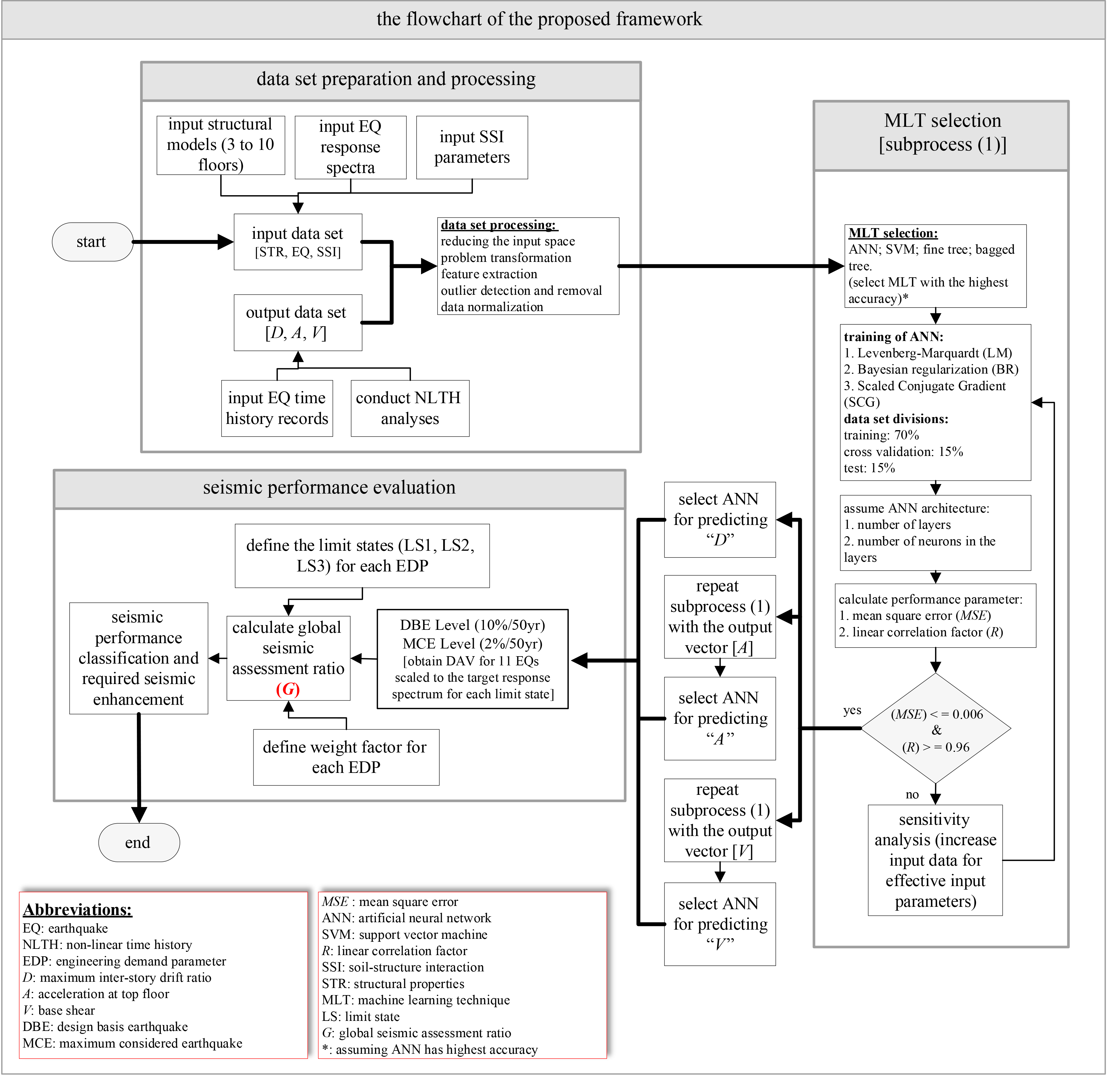 The objective of the current study is to propose an expert system framework based on a supervised machine learning technique (MLT) to predict the seismic performance of low- to mid-rise frame structures considering soil-structure interaction (SSI). The methodology of the framework is based on examining different MLTs to obtain the highest possible accuracy for prediction. Within the MLT, a sensitivity analysis was conducted on the main SSI parameters to select the most effective input parameters. Multiple limit state criteria were used for the seismic evaluation within the process. A new global seismic assessment ratio was introduced that considers both serviceability and strength aspects by utilizing three different engineering demand parameters (EDPs). The proposed framework is novel because it enables the designer to seismically assess the structure, while simultaneously considering different EDPs and multiple limit states. Moreover, the framework provides recommendations for building component design based on the newly introduced global seismic assessment ratio, which considers different levels of seismic hazards. The proposed framework was validated through comparison using non-linear time history (NLTH) analysis. The results show that the proposed framework provides more accurate results than conventional methods. Finally, the generalization potential of the proposed framework was tested by investigating two different types of structural irregularities, namely, stiffness and mass irregularities. The results from the framework were in good agreement with the NLTH analysis results for the selected case studies, and peak ground acceleration (PGA) was found to be the most influential input parameter in the assessment process for the case study models investigated. The proposed framework shows high generalization potential for low- to mid-rise structures.