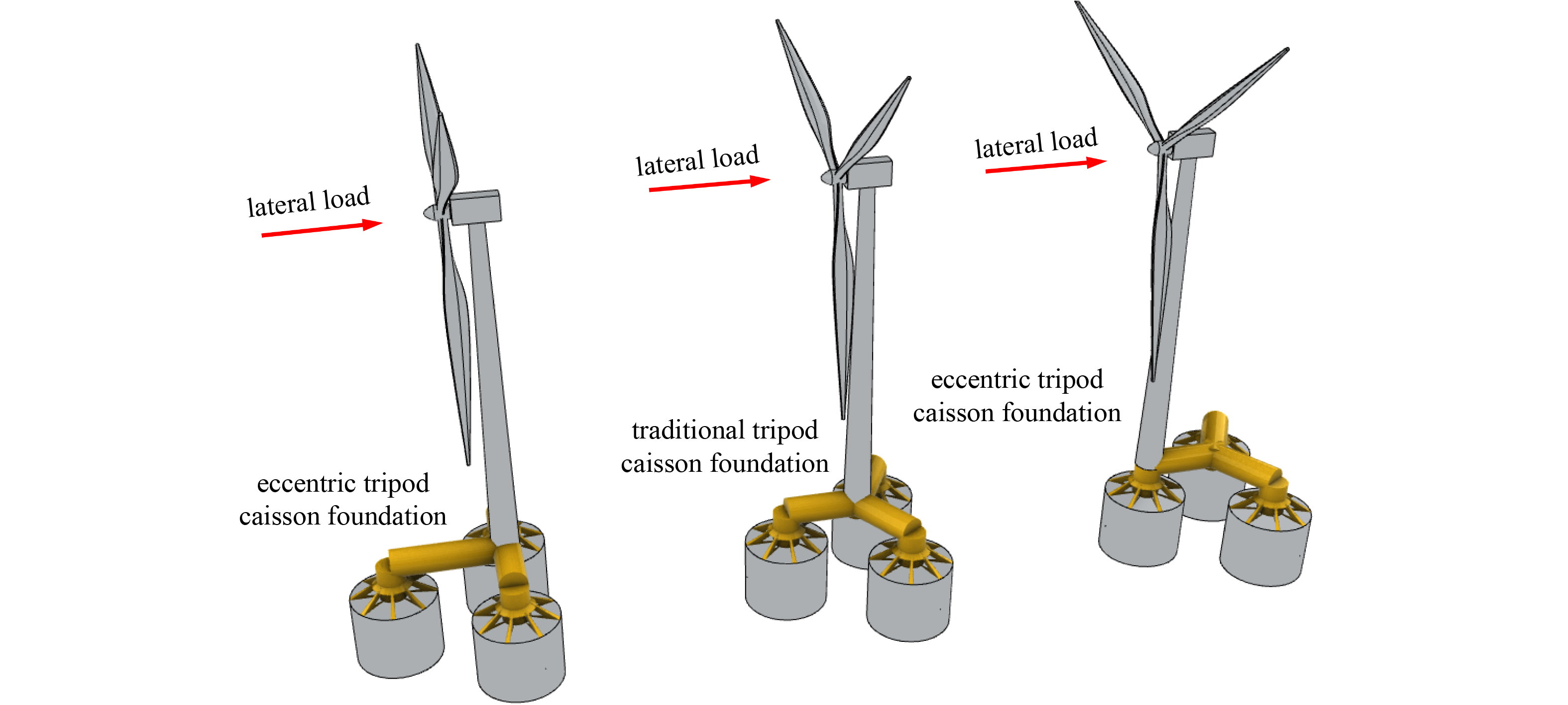 In this study, model tests were conducted to investigate the bearing capacities of tripod caisson foundations subjected to eccentric lateral loads in silty clay. Lateral load–rotation curves of five eccentric-shaped tripod suction foundations were plotted to analyze the bearing capacities at different loading angles. It was observed that the loading angle significantly influenced the bearing capacity of the foundations, particularly for eccentric tripod caisson foundations. Compared with eccentric tripod caisson foundations, the traditional tripod foundation has a relatively high ultimate lateral capacity at the omnidirectional loading angle. By analyzing the displacement of the caissons, a formula for the rotational center of the tripod caisson foundation subjected to an eccentric lateral load was derived. The depth of the rotation center was 0.68–0.92 times the height of the caisson when the bearing capacity reached the limit. Under the undrained condition, suction was generated under the lid of the “up-lift” caisson, which helps resist lateral forces from the wind and waves.
