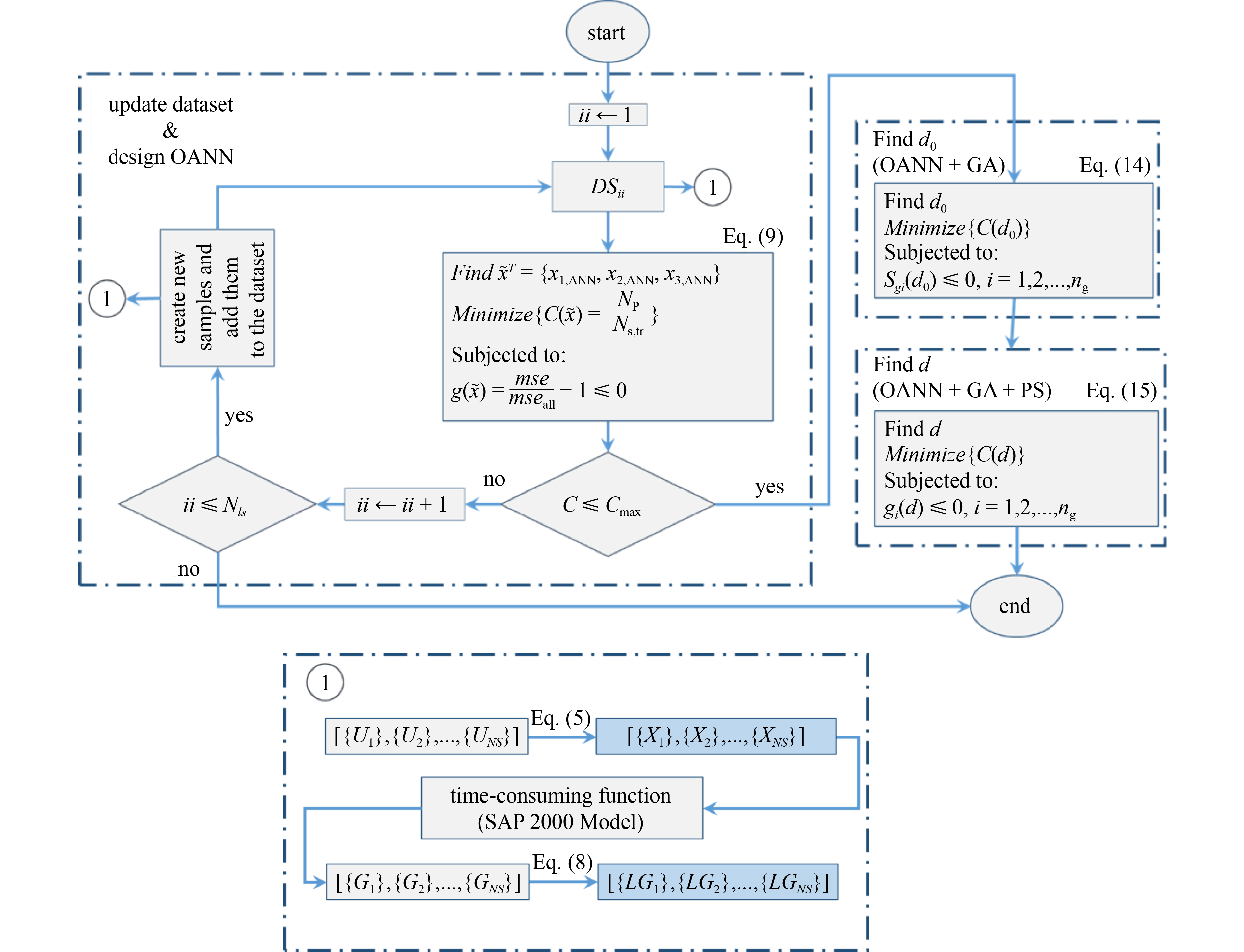This paper presents a combined method based on optimized neural networks and optimization algorithms to solve structural optimization problems. The main idea is to utilize an optimized artificial neural network (OANN) as a surrogate model to reduce the number of computations for structural analysis. First, the OANN is trained appropriately. Subsequently, the main optimization problem is solved using the OANN and a population-based algorithm. The algorithms considered in this step are the arithmetic optimization algorithm (AOA) and genetic algorithm (GA). Finally, the abovementioned problem is solved using the optimal point obtained from the previous step and the pattern search (PS) algorithm. To evaluate the performance of the proposed method, two numerical examples are considered. In the first example, the performance of two algorithms, OANN + AOA + PS and OANN + GA + PS, is investigated. Using the GA reduces the elapsed time by approximately 50% compared with using the AOA. Results show that both the OANN + GA + PS and OANN + AOA + PS algorithms perform well in solving structural optimization problems and achieve the same optimal design. However, the OANN + GA + PS algorithm requires significantly fewer function evaluations to achieve the same accuracy as the OANN + AOA + PS algorithm.