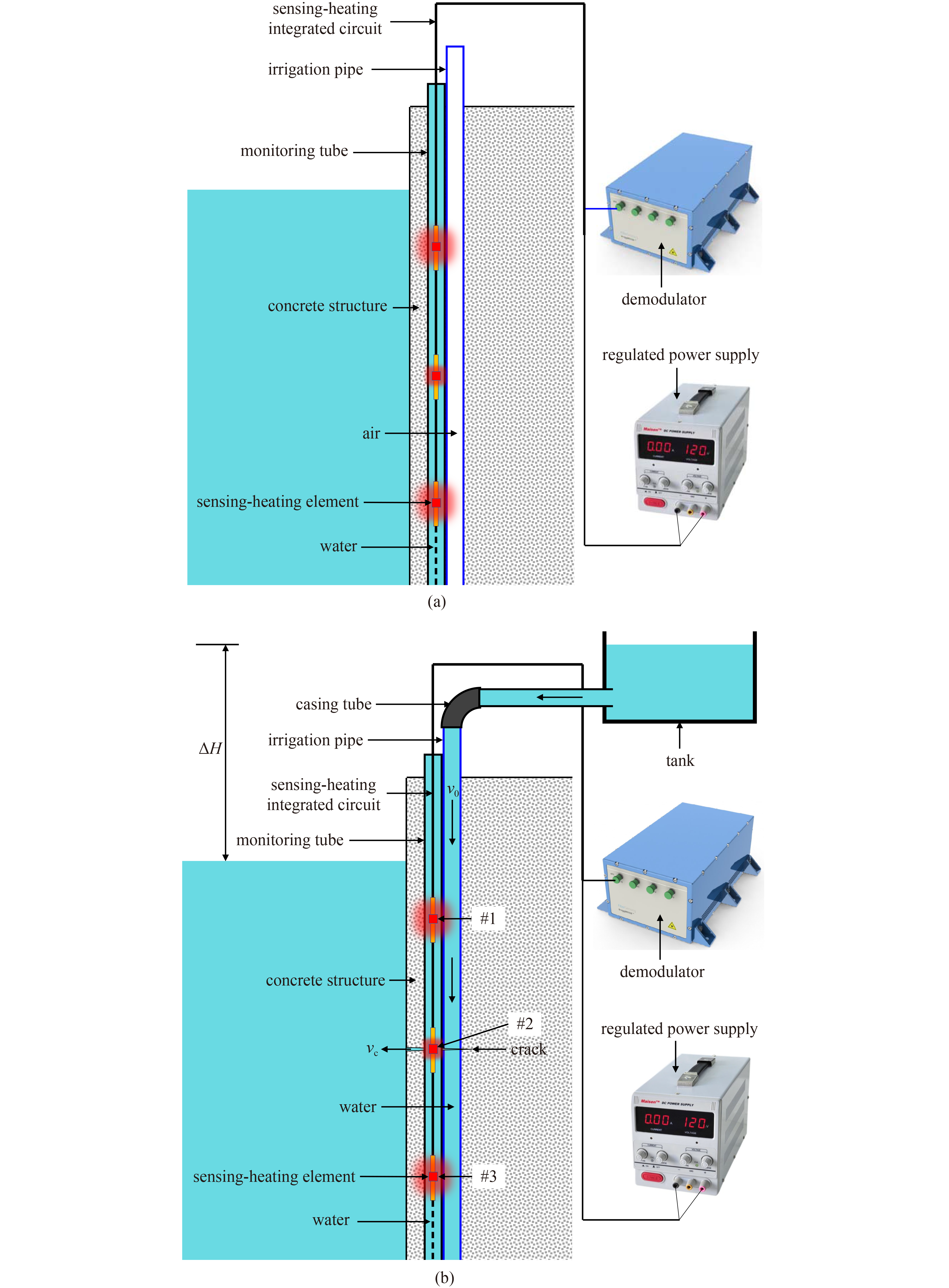 Cracking in wading-concrete structures has a worse impact on structural safety compared with conventional concrete structures. The accurate and timely monitoring of crack development plays a significant role in the safety of wading-concrete engineering. The heat-transfer rate near a crack is related to the flow velocity of the fluid in the crack. Based on this, a novel crack-identification method for underwater concrete structures is presented. This method uses water irrigation to generate seepage at the interface of a crack; then, the heat-dissipation rate in the crack area will increase because of the convective heat-transfer effect near the crack. Crack information can be identified by monitoring the cooling law and leakage flow near cracks. The proposed mobile crack-monitoring system consists of a heating system, temperature-measurement system, and irrigation system. A series of tests was conducted on a reinforced-concrete beam using this system. The crack-discrimination index ψ was defined, according to the subsection characteristics of the heat-source cooling curve. The effects of the crack width, leakage flow, and relative positions of the heat source and crack on ψ were studied. The results showed that the distribution characteristics of ψ along the monitoring line could accurately locate the crack, but not quantify the crack width. However, the leakage flow is sensitive to the crack width and can be used to identify it.