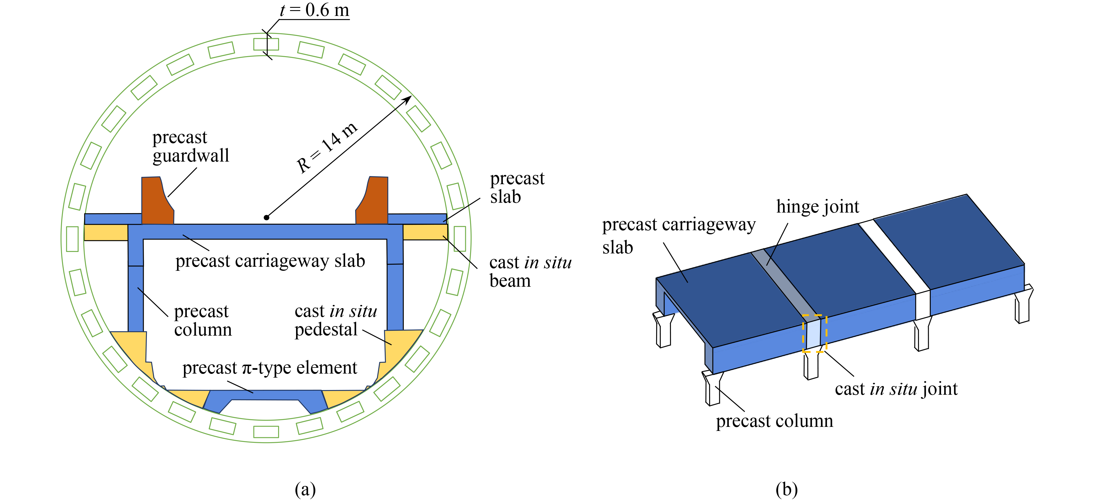 Prefabricated internal structures of road tunnels, consisting of precast elements and the connections between them, provide advantages in terms of quality control and manufacturing costs. However, the limited construction space in tunnels creates challenges for on-site assembly. To identify feasible connecting joints, flexural tests of precast straight beams connected by welding-spliced or lap-spliced reinforcements embedded in normal concrete or ultra-high-performance fiber-reinforced concrete (UHPFRC) are first performed and analyzed. With an improvement in the strength grade of the closure concrete for the lap-spliced joint, the failure of the beam transforms from a brittle splitting mode to a ductile flexural mode. The beam connected by UHPFRC100 with short lap-spliced reinforcements can achieve almost equivalent mechanical performance in terms of the bearing capacity, ductility, and stiffness as the beam connected by normal concrete with welding-spliced reinforcements. This favorable solution is then applied to the connection of neighboring updeck slabs resting on columns in a double-deck tunnel. The applicability is validated by flexural tests of T-shaped joints, which, fail in a ductile fashion dominated by the ultimate bearing capacity of the precast elements, similar to the corresponding straight beam. The utilization of UHPFRC significantly reduces the required lap-splice length of reinforcements owing to its strong bonding strength.