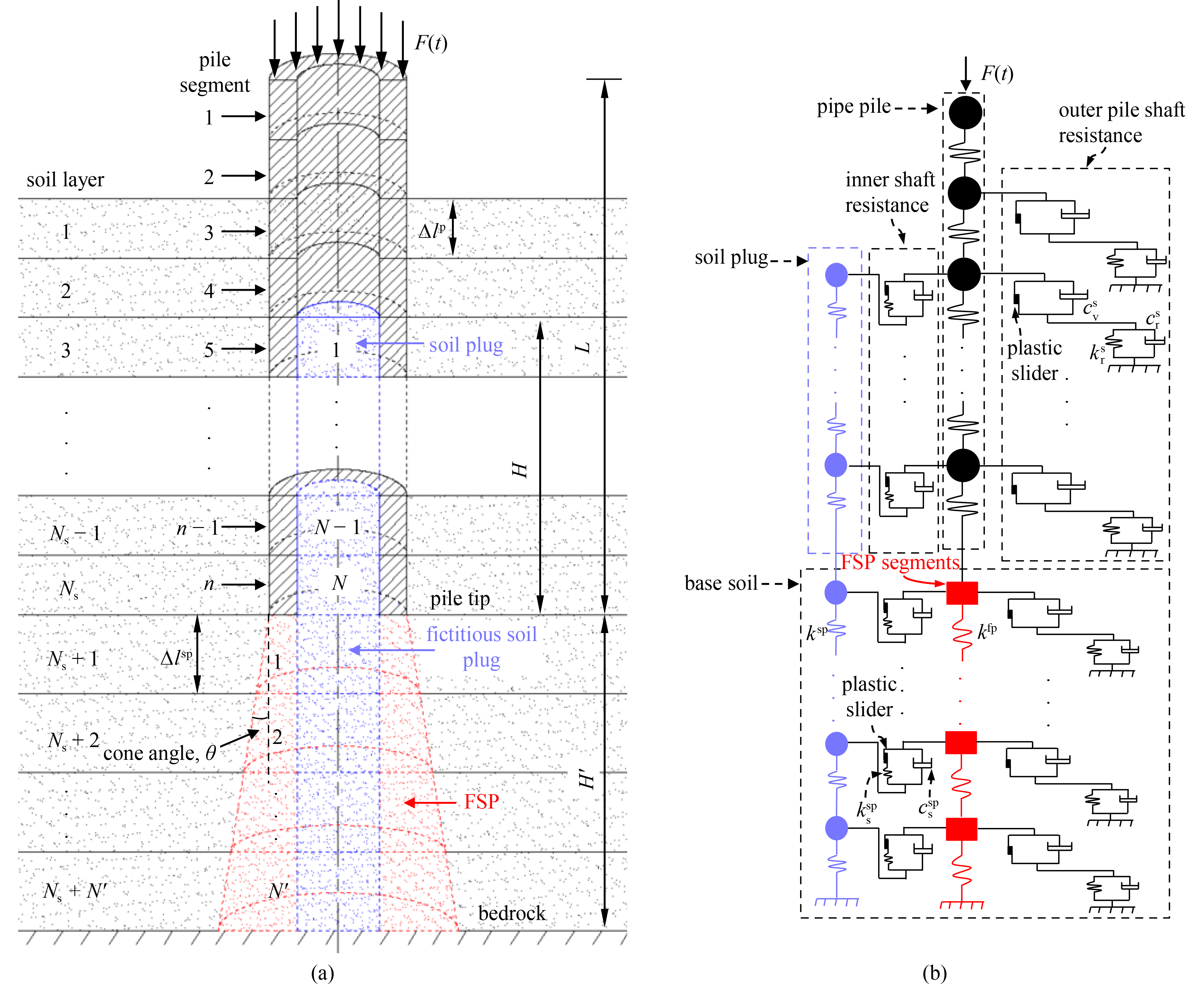 A fictitious soil pile (FSP) model is developed to simulate the behavior of pipe piles with soil plugs undergoing high-strain dynamic impact loading. The developed model simulates the base soil with a fictitious hollow pile fully filled with a soil plug extending at a cone angle from the pile toe to the bedrock. The friction on the outside and inside of the pile walls is distinguished using different shaft models, and the propagation of stress waves in the base soil and soil plug is considered. The motions of the pile−soil system are solved by discretizing them into spring-mass model based on the finite difference method. Comparisons of the predictions of the proposed model and conventional numerical models, as well as measurements for pipe piles in field tests subjected to impact loading, validate the accuracy of the proposed model. A parametric analysis is conducted to illustrate the influence of the model parameters on the pile dynamic response. Finally, the effective length of the FSP is proposed to approximate the affected soil zone below the pipe pile toe, and some guidance is provided for the selection of the model parameters.