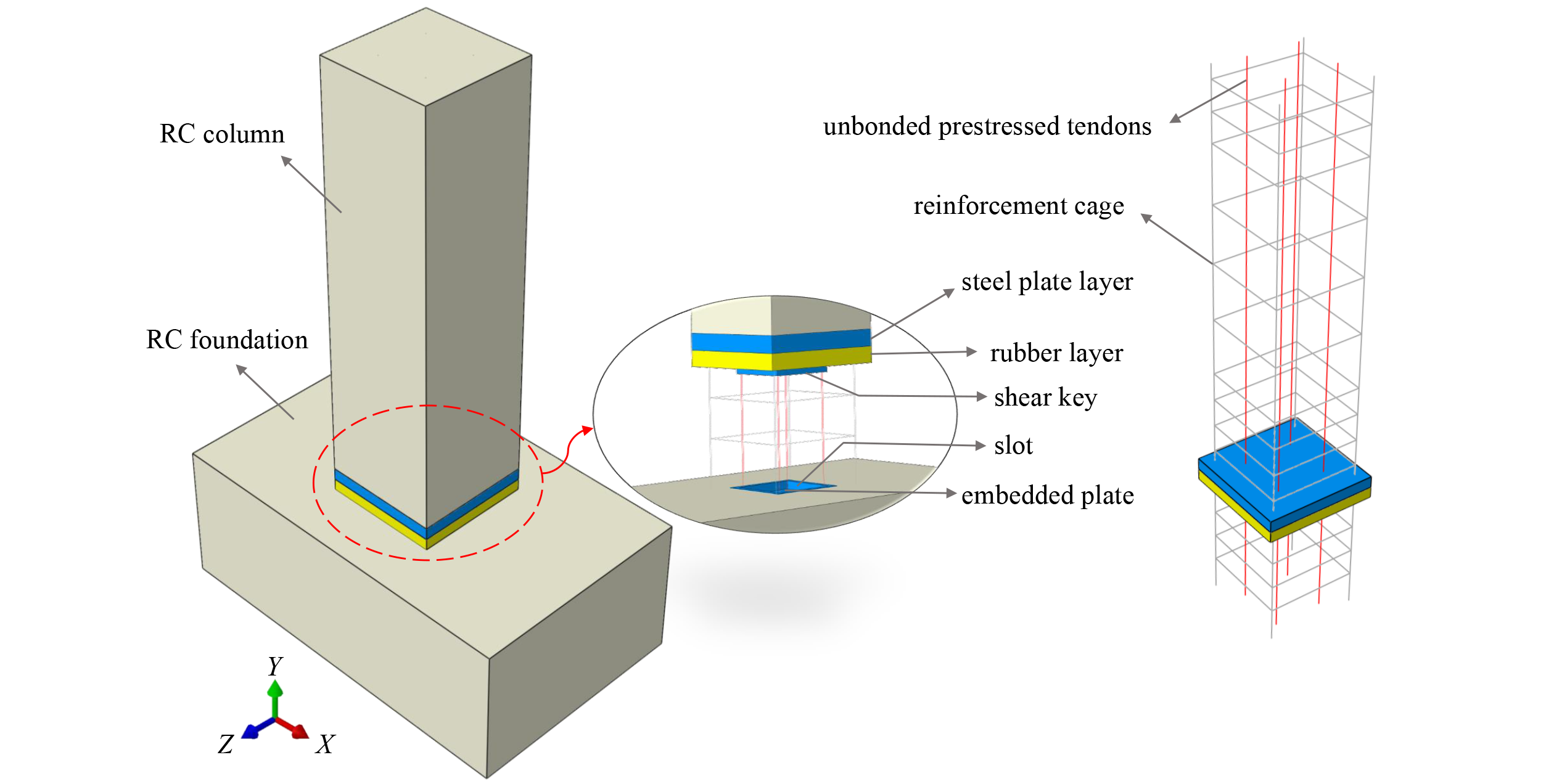 To realize seismic-resilient reinforced concrete (RC) moment-resisting frame structures, a novel self-centering RC column with a rubber layer placed at the bottom (SRRC column) is proposed herein. For the column, the longitudinal reinforcement dissipates seismic energy, the rubber layer allows the rocking of the column, and the unbonded prestressed tendon enables self-centering capacity. A refined finite element model of the SRRC column is developed, the effectiveness of which is validated based on experimental results. Results show that the SRRC column exhibits stable energy dissipation capacity and no strength degradation; additionally, it can significantly reduce permanent residual deformation and mitigate damage to concrete. Extensive parametric studies pertaining to SRRC columns have been conducted to investigate the critical factors affecting their seismic performance.