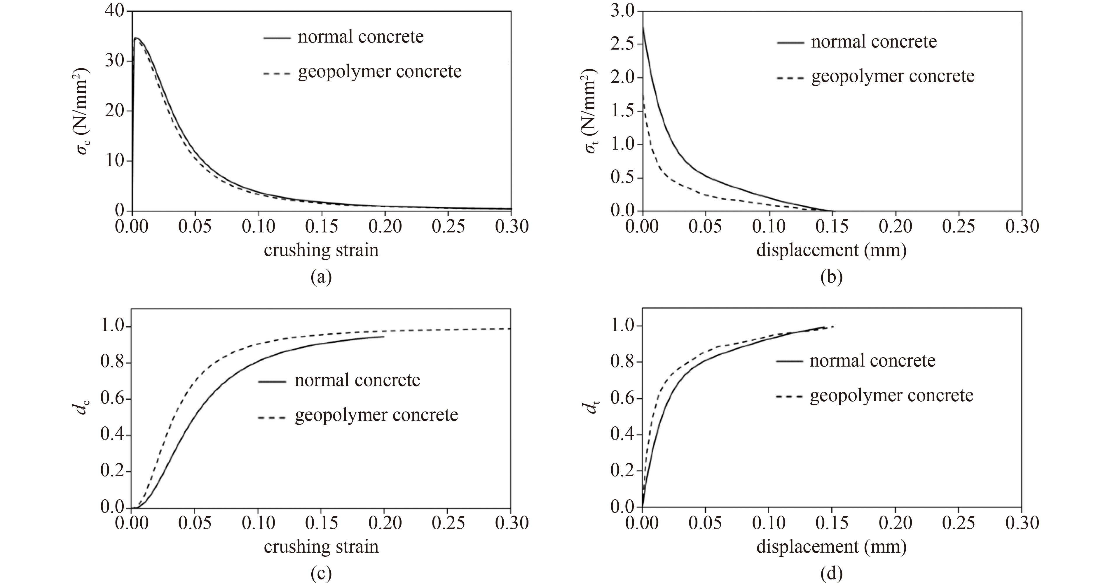 In this study, the concrete cone capacity, concrete cone angle, and load–displacement response of cast-in headed anchors in geopolymer concrete are explored using numerical analyses. The concrete damaged plasticity (CDP) model in ABAQUS is used to simulate the behavior of concrete substrates. The tensile behavior of anchors in geopolymer concrete is compared with that in normal concrete as well as that predicted by the linear fracture mechanics (LFM) and concrete capacity design (CCD) models. The results show that the capacity of the anchors in geopolymer concrete is 30%–40% lower than that in normal concrete. The results also indicate that the CCD model overestimates the capacity of the anchors in geopolymer concrete, whereas the LFM model provides a much more conservative prediction. The extent of the difference between the predictions by the numerical analysis and those of the above prediction models depends on the effective embedment depth of the anchor and the anchor head size. The influence of concrete surface cracking on the capacity of the anchor is shown to depend on the location of the crack and the effective embedment depth. The influence of the anchor head profile on the tensile capacity of the anchors is found to be insignificant.