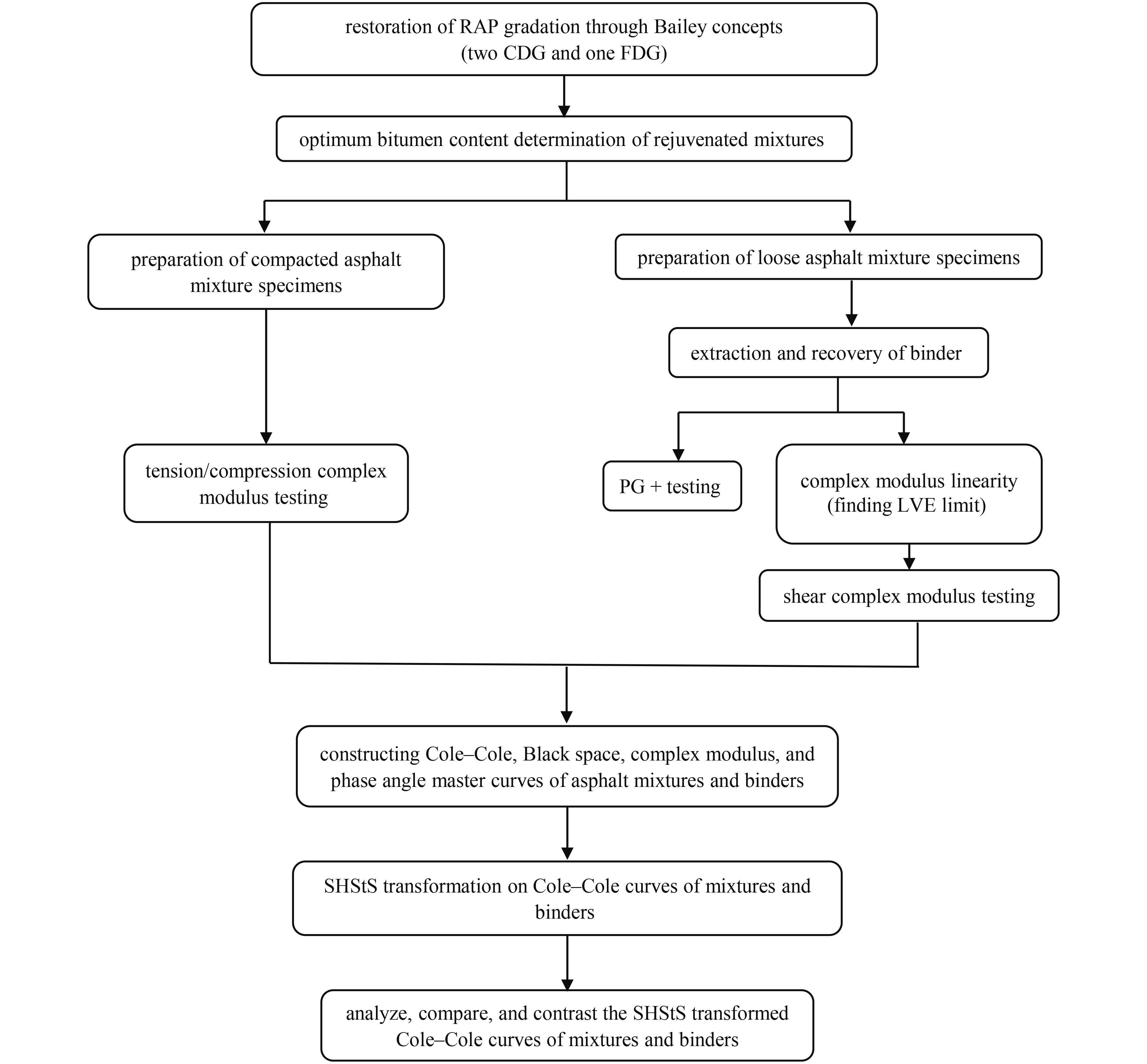 The primary aim of this study is to correlate the impact of aggregates, if any, on the viscoelastic behavior of rejuvenated asphalt mixtures containing very high amounts of reclaimed asphalt pavement (RAP) (> 50%). First, gradation of 100% RAP was rectified, using a modified Bailey method by adding virgin aggregates to achieve two coarse dense-graded and one fine dense-graded blends. Complex modulus test was then performed from −35 to +35 °C and 0.01–10 Hz. In addition to performance grade (PG) testing, extracted and recovered binders from different asphalt mixtures underwent shear complex modulus test within −8 °C to high temperature PG and frequencies from 0.001 to 30 Hz. Cole−Cole, Black space, complex modulus and phase angle master curves were constructed and Shift-Homothety-Shift in time-Shift (SHStS) transformation was used to compare the linear viscoelastic behavior of asphalt binders and mixtures. The influence of aggregates on the viscoelastic behavior of asphalt mixtures depends on temperature and/or frequency. The role of asphalt binders in the behavior of asphalt mixtures is more pronounced at high temperatures and the effect of the aggregate structure increases as the temperature falls. The maximum difference (60% to 70%) in the viscoelastic behavior of the binder and mixture based on SHStS transformed Cole−Cole curves is within the phase angle of 15°–20°.