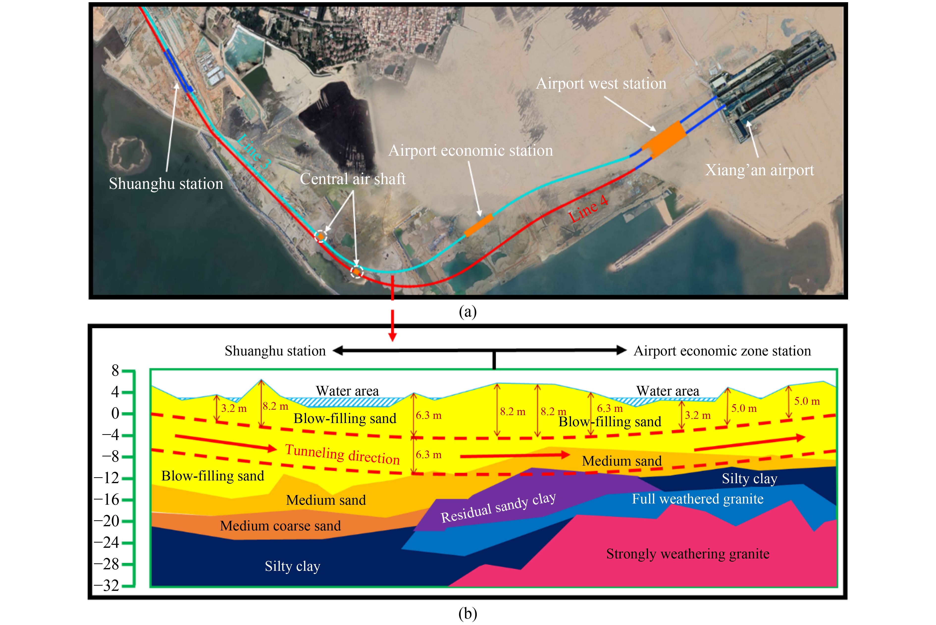 Face passive failure can severely damage existing structures and underground utilities during shallow shield tunneling, especially in coastal backfill sand. In this work, a series of laboratory model tests were developed and conducted to investigate such failure, for tunnels located at burial depth ratios for which C/D = 0.5, 0.8, 1, and 1.3. Support pressures, the evolution of failure processes, the failure modes, and the distribution of velocity fields were examined through model tests and numerical analyses. The support pressure in the tests first rose rapidly to the elastic limit and then gradually increased to the maximum value in all cases. The maximum support pressure decreased slightly in cases where C/D = 0.8, 1, and 1.3, but the rebound was insignificant where C/D = 0.5. In addition, the configuration of the failure mode with C/D = 0.5 showed a wedge-shaped arch, which was determined by the outcropping shear failure. The configuration of failure modes was composed of an arch and the inverted trapezoid when C/D = 0.8, 1, and 1.3, in which the mode was divided into lower and upper failure zones.