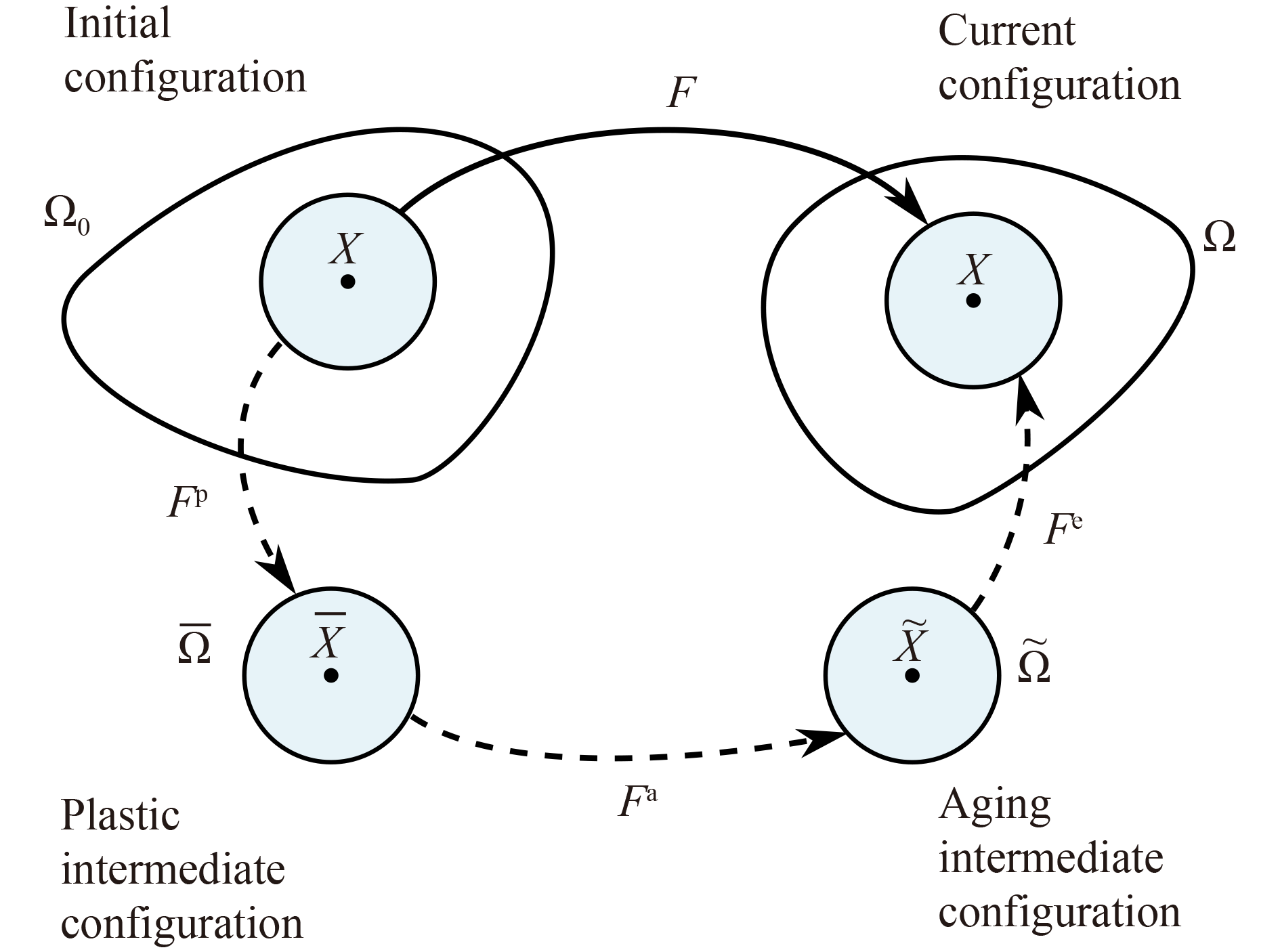 Deformation control constitutes one of the main technological challenges in three dimensional (3D) concrete printing, and it presents a challenge that must be addressed to achieve a precise and reliable construction process. Model-based information of the expected deformations and stresses is required to optimize the construction process in association with the specific properties of the concrete mix. In this work, a novel thermodynamically consistent finite strain constitutive model for fresh and early-age 3D-printable concrete is proposed. The model is then used to simulate the 3D concrete printing process to assess layer shapes, deformations, forces acting on substrate layers and prognoses of possible structural collapse during the layer-by-layer buildup. The constitutive formulation is based on a multiplicative split of the deformation gradient into elastic, aging and viscoplastic parts, in combination with a hyperelastic potential and considering evolving material properties to account for structural buildup or aging. One advantage of this model is the stress-update-scheme, which is similar to that of small strain plasticity and therefore enables an efficient integration with existing material routines. The constitutive model uses the particle finite element method, which serves as the simulation framework, allowing for modeling of the evolving free surfaces during the extrusion process. Computational analyses of three printed layers are used to create deformation plots, which can then be used to control the deformations during 3D concrete printing. This study offers further investigations, on the structural level, focusing on the potential structural collapse of a 3D printed concrete wall. The capability of the proposed model to simulate 3D concrete printing processes across the scales—from a few printed layers to the scale of the whole printed structure—in a unified fashion with one constitutive formulation, is demonstrated.