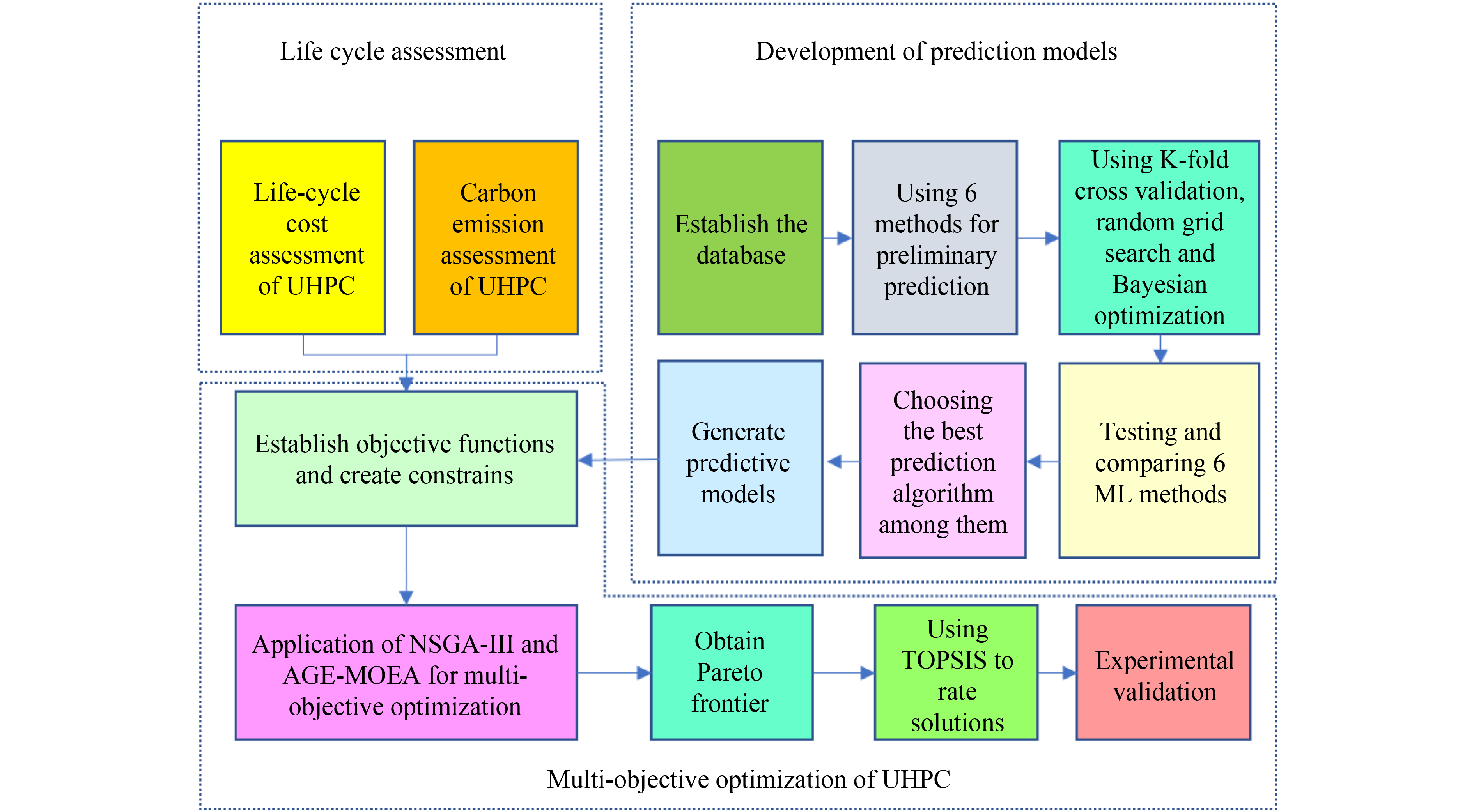 Ultra-high performance concrete (UHPC) has gained a lot of attention lately because of its remarkable properties, even if its high cost and high carbon emissions run counter to the current development trend. To lower the cost and carbon emissions of UHPC, this study develops a multi-objective optimization framework that combines the non-dominated sorting genetic algorithm and 6 different machine learning methods to handle this issue. The key features of UHPC are filtered using the recursive feature elimination approach, and Bayesian optimization and random grid search are employed to optimize the hyperparameters of the machine learning prediction model. The optimal mix ratios of UHPC are found by applying the multi-objective algorithm non-dominated sorting genetic algorithm-III and multi-objective evolutionary algorithm based on adaptive geometric estimation. The results are evaluated by technique for order preference by similarity to ideal solution and validated by experiments. The outcomes demonstrate that the compressive strength and slump flow of UHPC are correctly predicted by the machine learning models. The multi-objective optimization produces Pareto fronts, which illustrate the trade-off between the mix’s compressive strength, slump flow, cost, and environmental sustainability as well as the wide variety of possible solutions. The research contributes to the development of cost-effective and environmentally sustainable UHPC, and aids in robust, intelligent, and sustainable building practices.