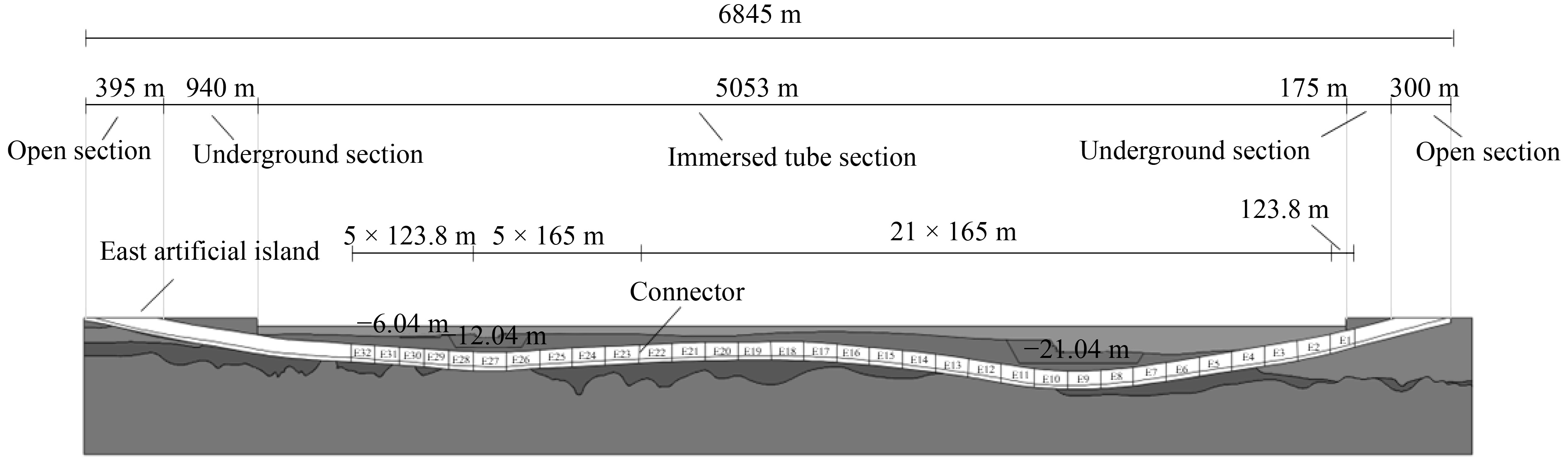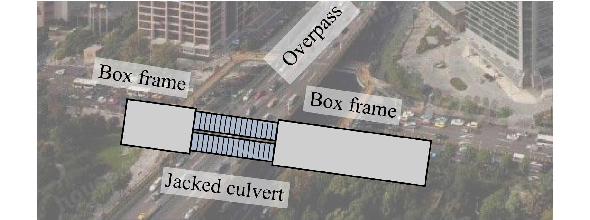 The underground structure with stiffness mutation at the culvert-frame connection suffers from discrepant dynamic responses when earthquakes strike. This paper studies the seismic responses of an underground structure consisting of two portions of box frames and twin jacked culverts in soft soil. The two portions of box frames (Part A and Part C) have the same 2-storey and 3-span cross sections, rigidly connected to the two parallel jacked culverts (Part B) with F-type sockets between joints. A series of 1g shaking table tests is conducted on the modeled soil−structure system. Accelerometers are installed within the model soil, upon culverts, and on the top of mid slabs of box frames. Joint extensions and closures of culverts are measured. The white noise case is carried out to assess dynamic characteristics of the model system. Four synthetic earthquake cases are conducted to investigate the model system’s seismic responses under earthquakes with varying intensities. Ground acceleration responses of the model soil at different distances from Part A are compared. The extent of discrepancy in acceleration of culverts and box frames is quantified by the correlation coefficient. The characteristics of the joint extension and closure are summarized.