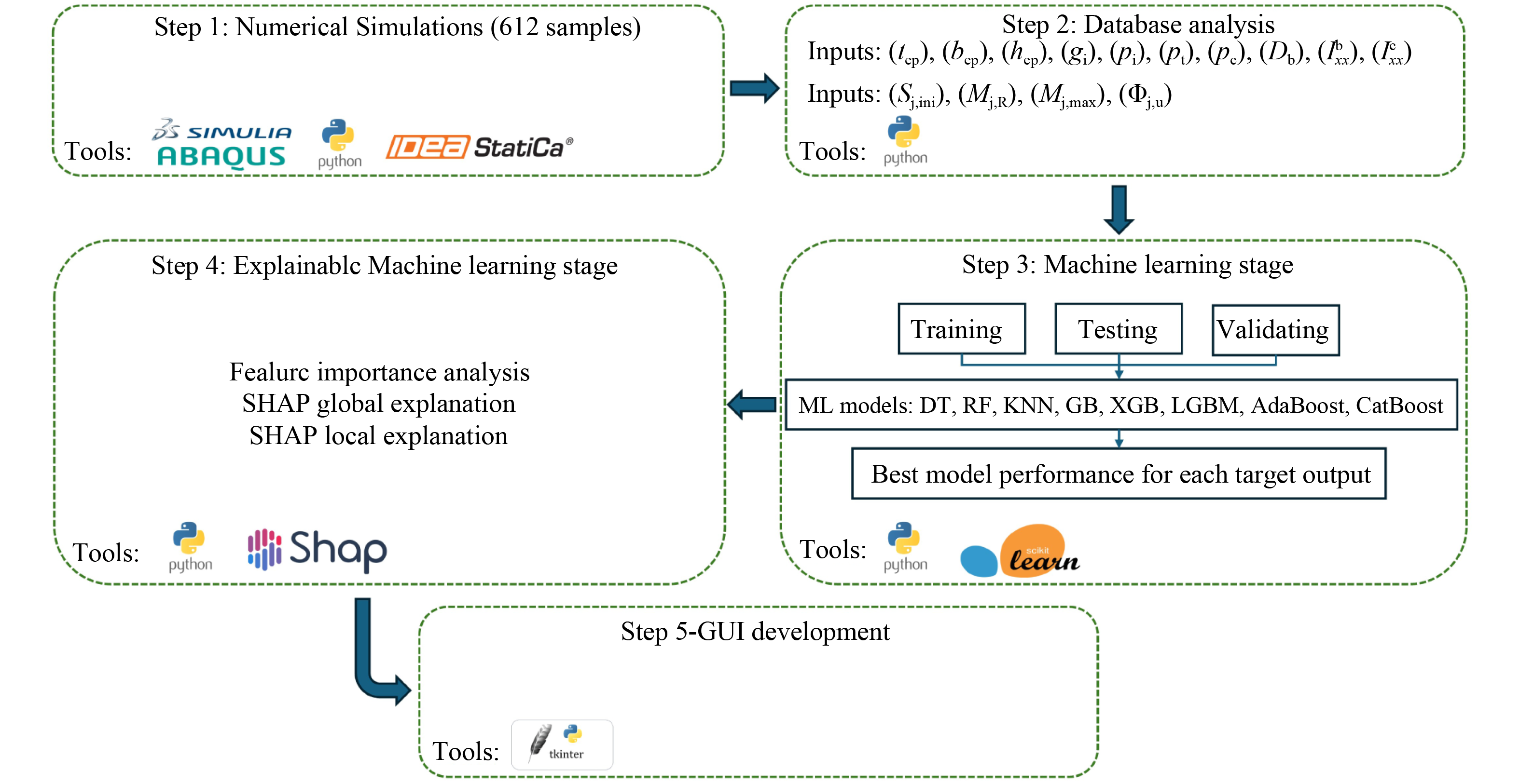 Stainless-steel provides substantial advantages for structural uses, though its upfront cost is notably high. Consequently, it’s vital to establish safe and economically viable design practices that enhance material utilization. Such development relies on a thorough understanding of the mechanical properties of structural components, particularly connections. This research advances the field by investigating the behavior of stainless-steel connections through the use of a four-parameter fitting technique and explainable artificial intelligence methods. Training was conducted on eight different machine learning algorithms, namely, Decision Tree, Random Forest, K-nearest neighbors, Gradient Boosting, Extreme Gradient Boosting, Light Gradient Boosting, Adaptive Boosting, and Categorical Boosting. SHapley Additive Explanations was applied to interpret model predictions, highlighting features like spacing between bolts in tension and end-plate height as highly impactful on the initial rotational stiffness and plastic moment resistance. Results showed that Extreme Gradient Boosting achieved a coefficient of determination score of 0.99 for initial stiffness and plastic moment resistance, while Gradient Boosting model had similar performance with maximum moment resistance and ultimate rotation. A user-friendly graphical user interface (GUI) was also developed, allowing engineers to input parameters and get rapid moment–rotation predictions. This framework offers a data-driven, interpretable alternative to conventional methods, supporting future design recommendations for stainless-steel beam-to-column connections.