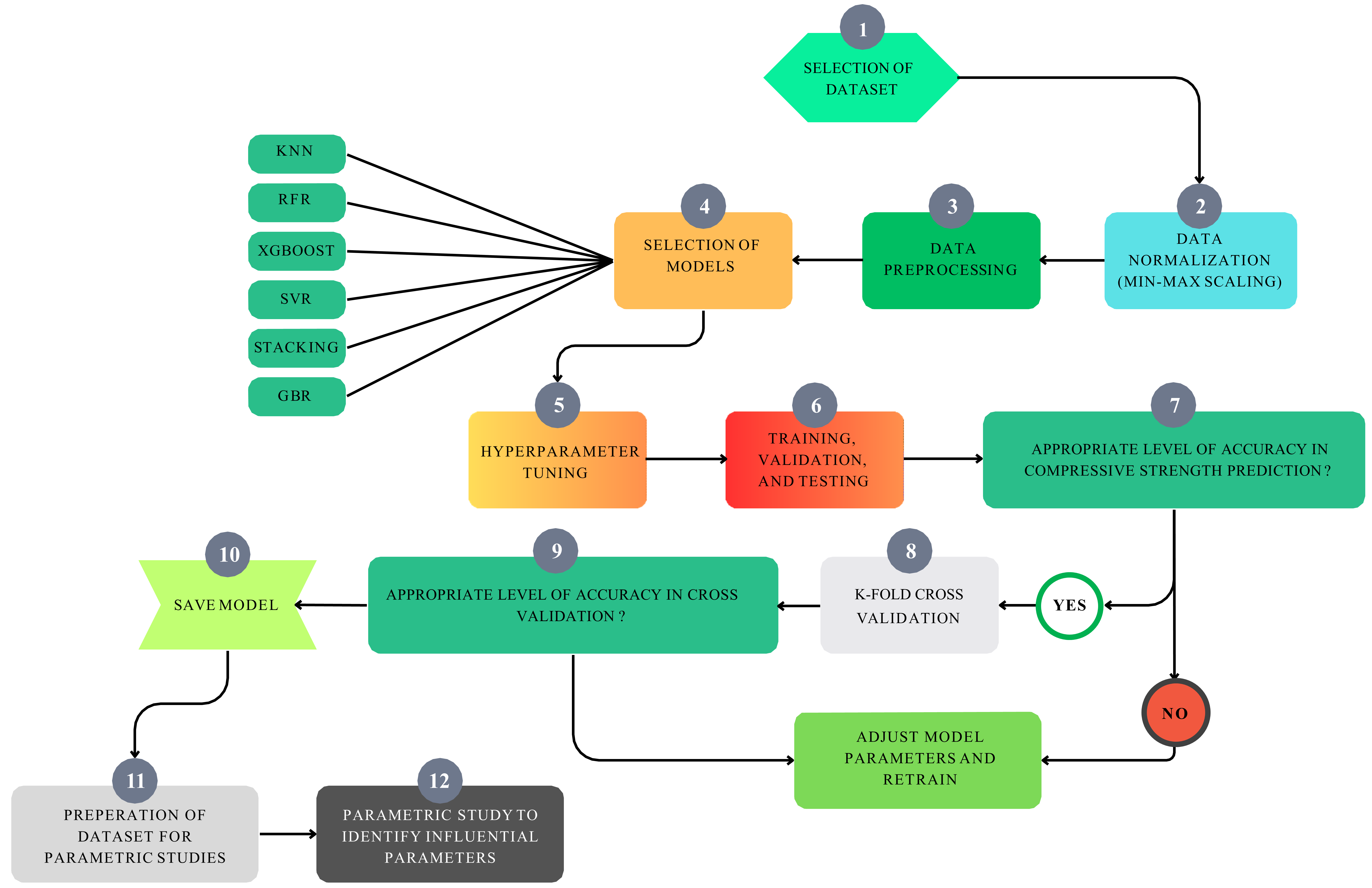 This study presents a robust framework for predicting the compressive strength of ultra-high performance concrete (UHPC) using machine learning models, based on a comprehensive data set of 761 data points derived from various UHPC mix designs. Six models, including K-Nearest Neighbors (KNN), Gradient Boosting Regression (GBR), Random Forest Regression (RFR), Support Vector Regression (SVR), Stacking and eXtreme Gradient Boosting (XGBoost), were evaluated. Among them, XGBoost demonstrated the best prediction accuracy, achieving a coefficient of determination (R2) of 0.969 and a root mean square error (RMSE) of 4.626 MPa, outperforming the other models. The Stacking model also performed well with an R2 of 0.960, though it slightly overestimated at higher compressive strength levels. SHapley Additive exPlanations (SHAP) analysis revealed that curing time, silica fume, and aggregate content were the most significant factors influencing compressive strength. Curing time emerged as the dominant factor, significantly surpassing other variables such as silica fume and aggregate content in its impact on compressive strength. This dominance is attributed to its critical role in hydration and compressive strength development, while silica fume and aggregates primarily contributed by enhancing matrix densification and structural integrity. SHAP feature dependency analysis further highlighted complex interactions, particularly between water content and superplasticizer dosage, affecting workability and compressive strength.