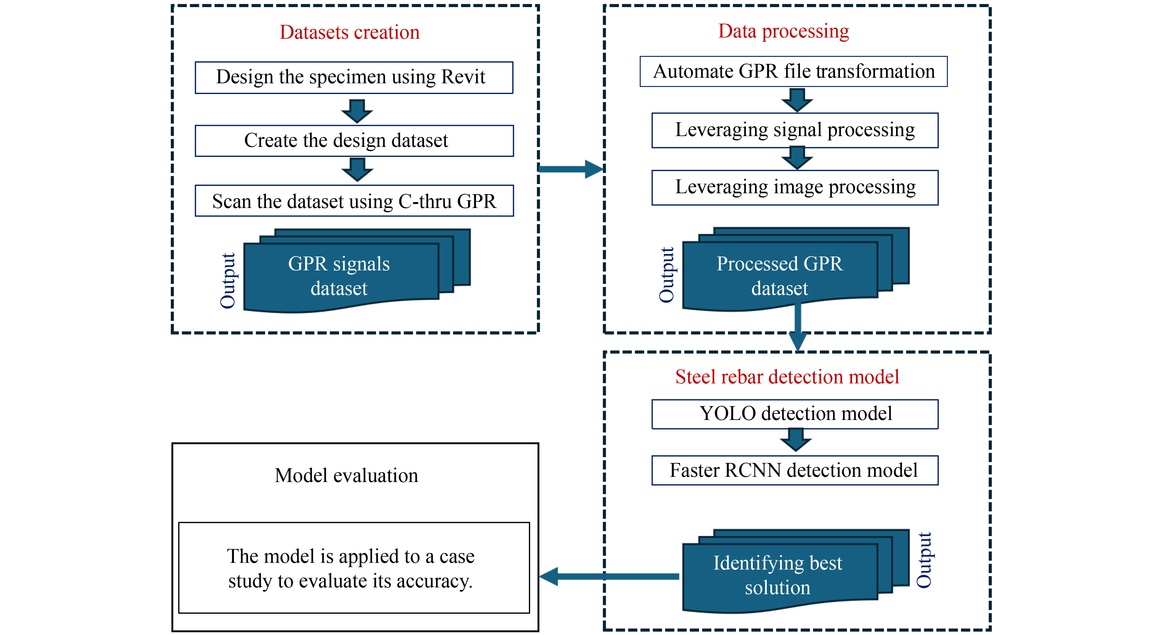 Traditional evaluation of reinforced rebar in concrete elements involves destructive methods that may harm the building. This paper introduces a framework that adopts non-destructive techniques to classify rebar in reinforced concrete elements. The framework integrates Ground Penetrating Radar (GPR) with deep learning to automate rebar detection and analysis in concrete elements. The framework consists of four stages: Data sets Creation, Data sets Processing, Steel Rebar Detection Model, and Transfer Learning. Different deep learning models are tested to choose the highest-performing model. The YOLO v8 model outperforms Faster R-CNN and YOLO v7. The selected YOLO v8 model is trained on experimental and site data and then tested on real data from the building to validate the model’s accuracy and ability to classify rebar diameter. Integrating GPR with deep learning can potentially improve the accuracy and efficiency of rebar detection in structural assessments.